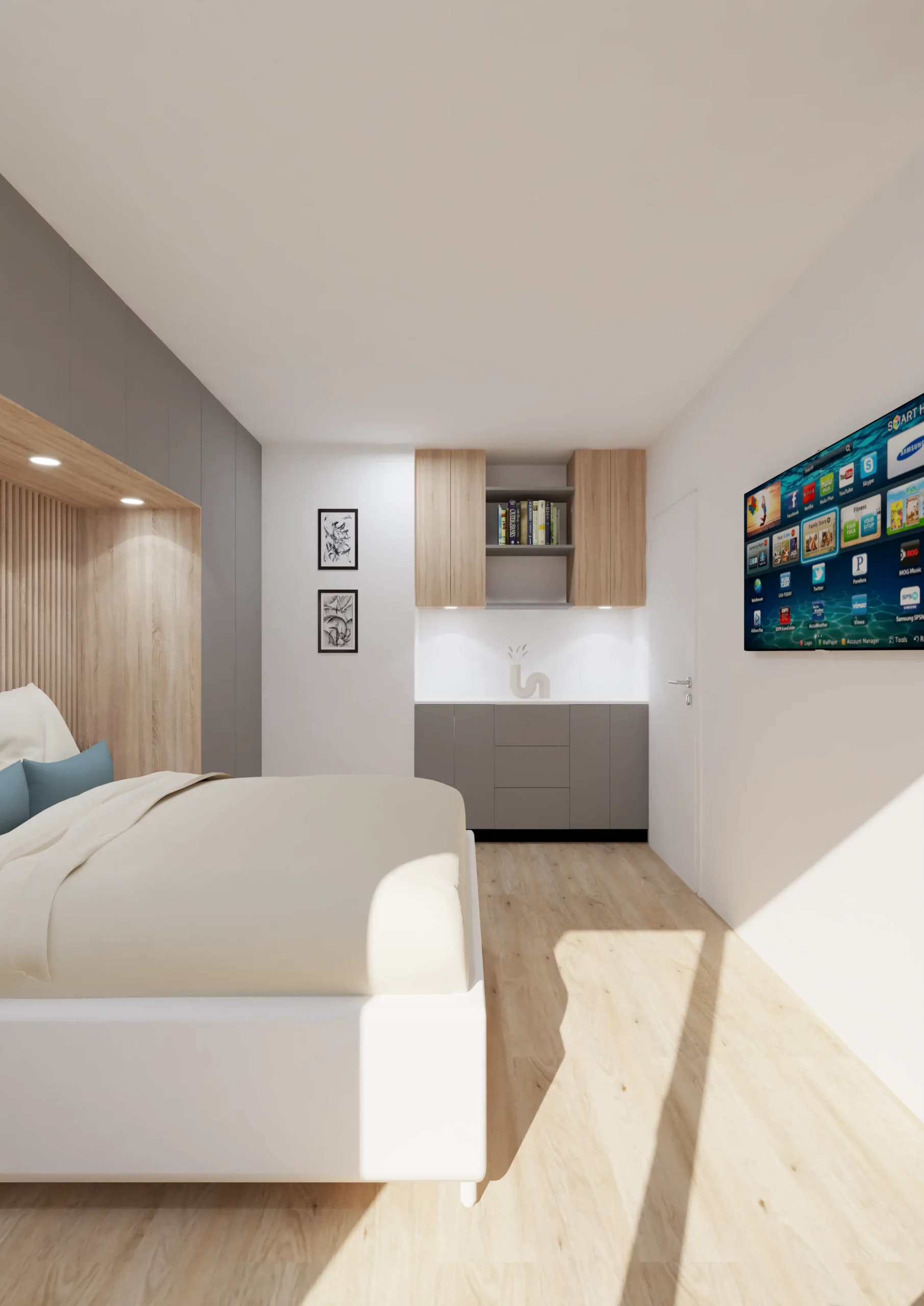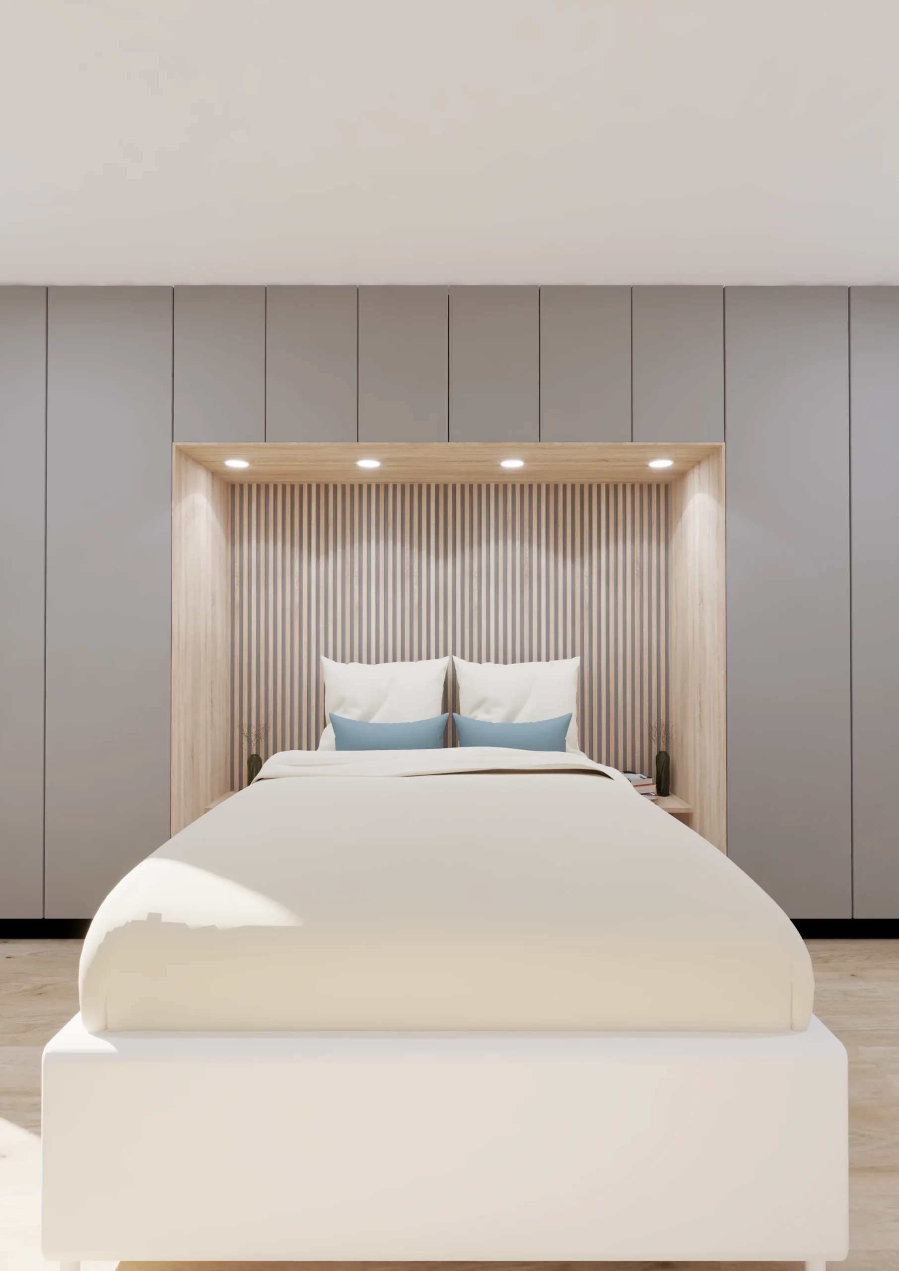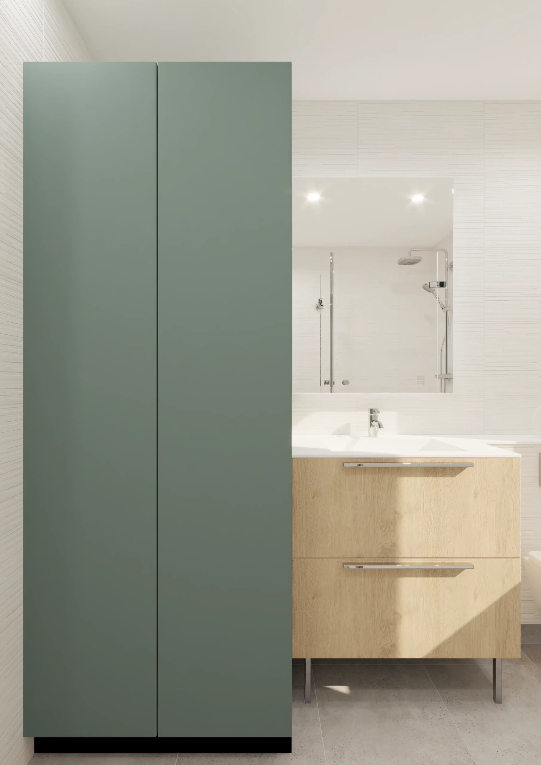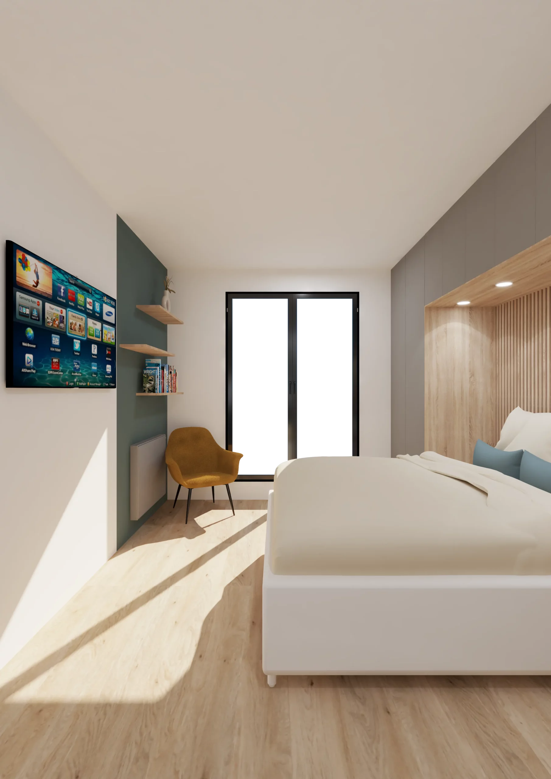Dans la chambre le dressing mural à été pensé pour qu’il puisse s’intégrer harmonieusement dans celle-ci et offrir le côté pratique et esthétique.