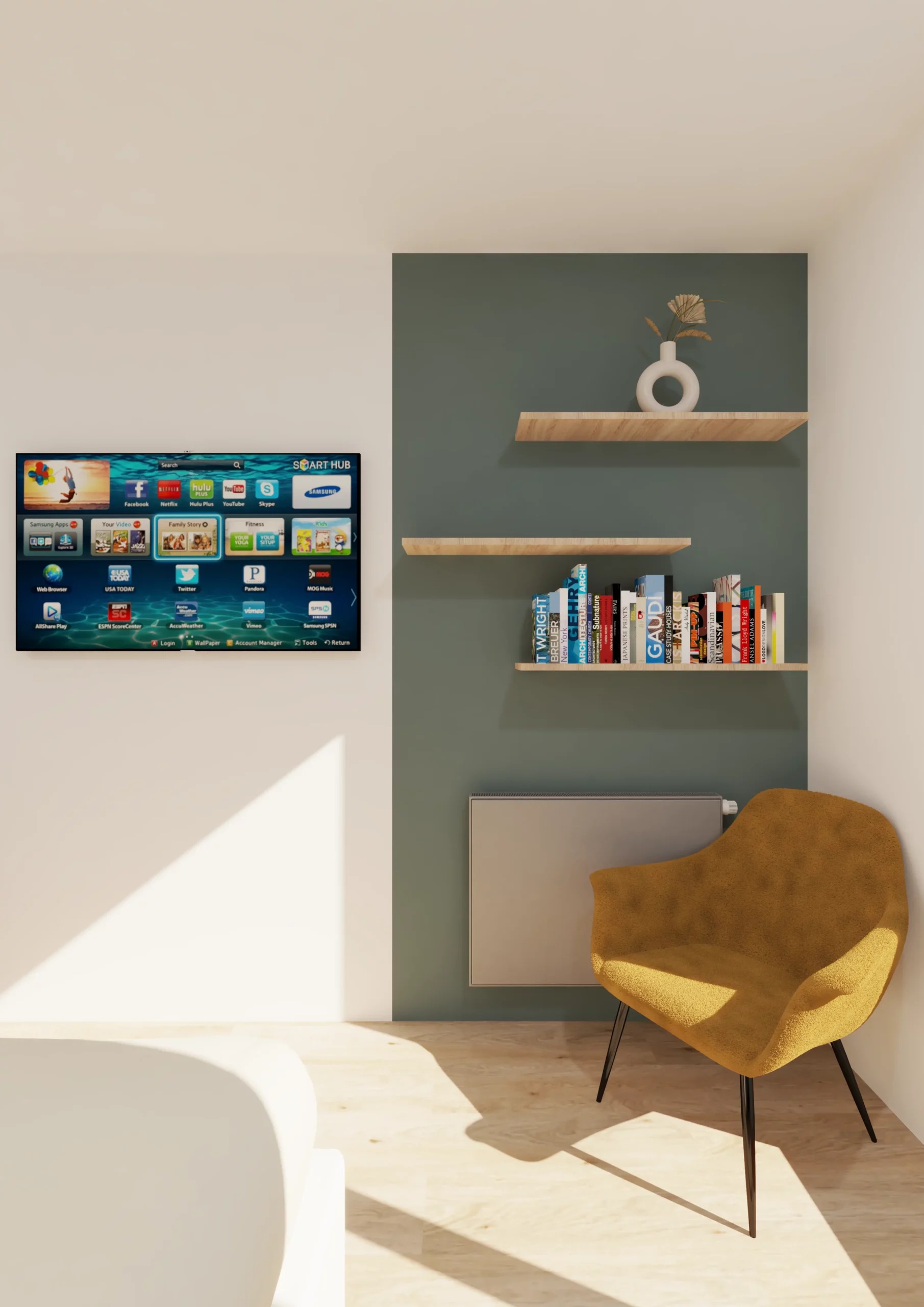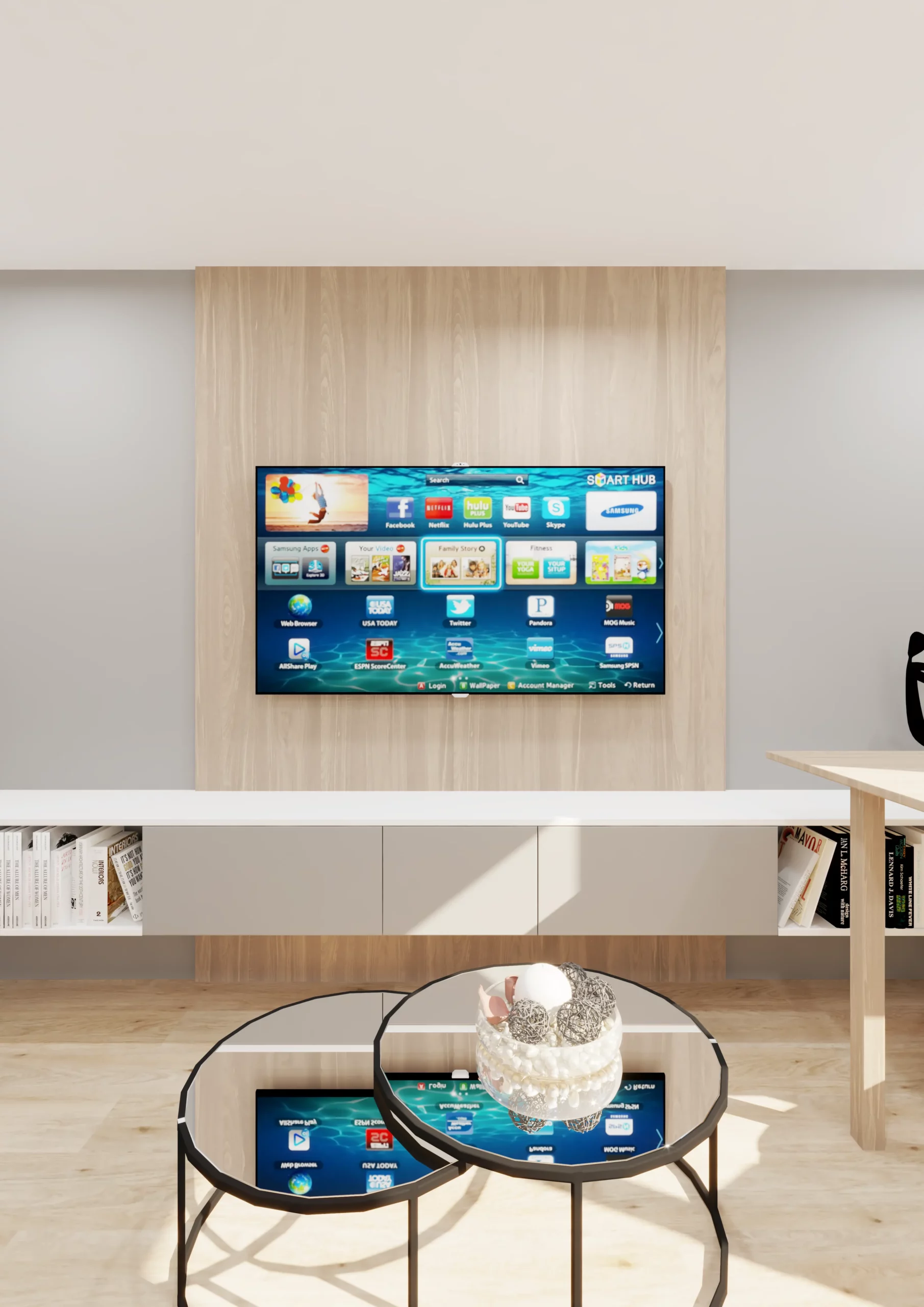 Le salon étant un espace de vie nous avons opter pour le canapé au centre afin de pouvoir circuler autour de celui-ci et ne pas gêner le passage, un linéaire a été créé afin de reste dans le côte « sobre » etc…