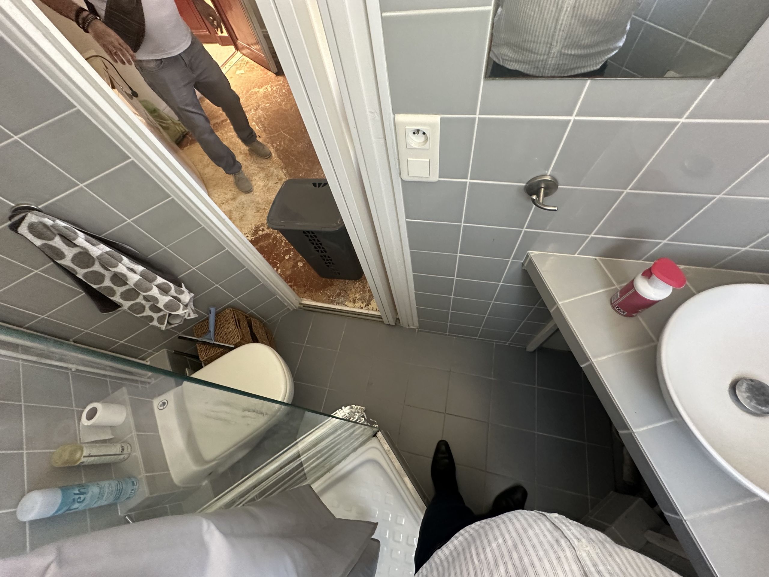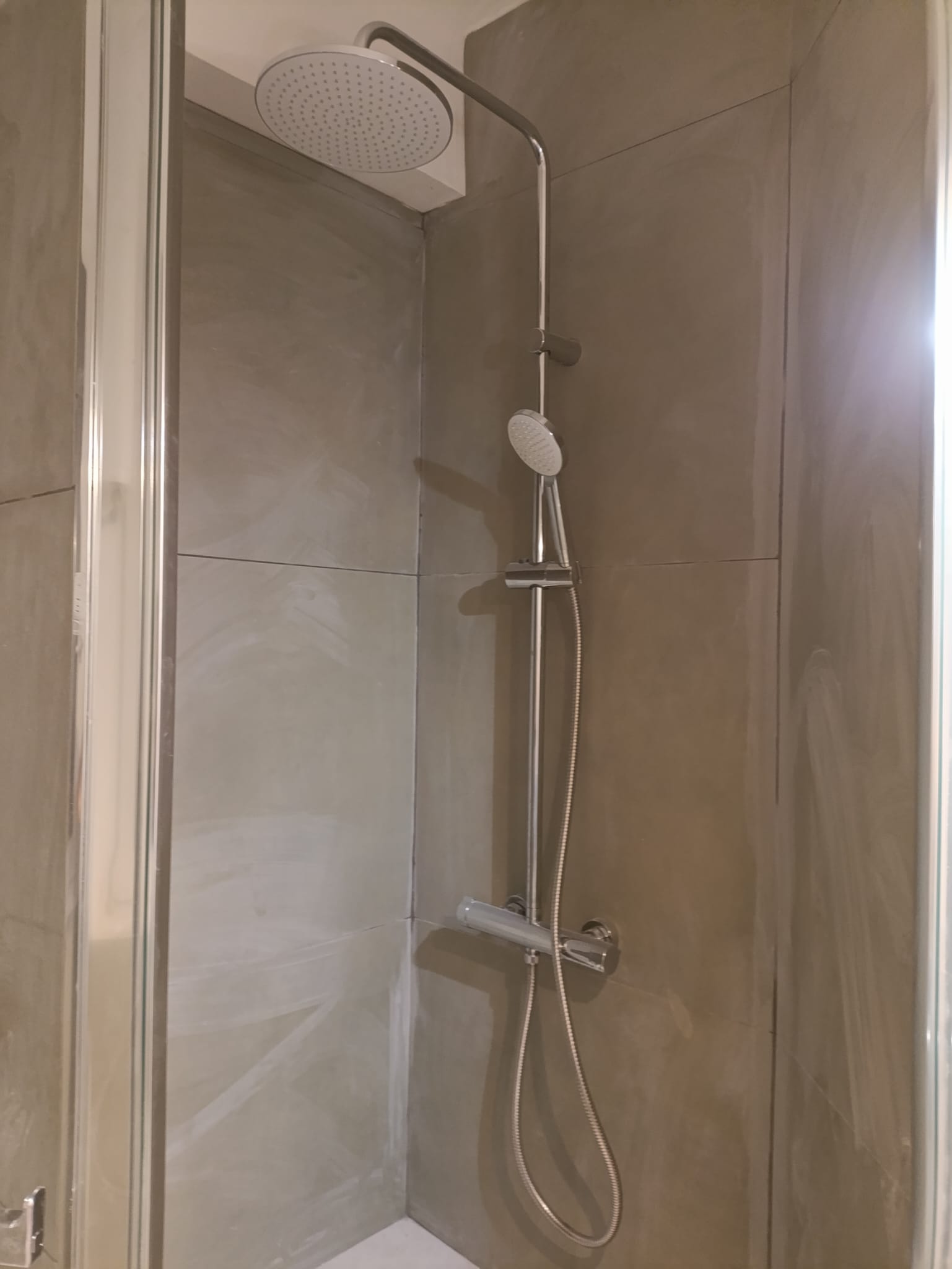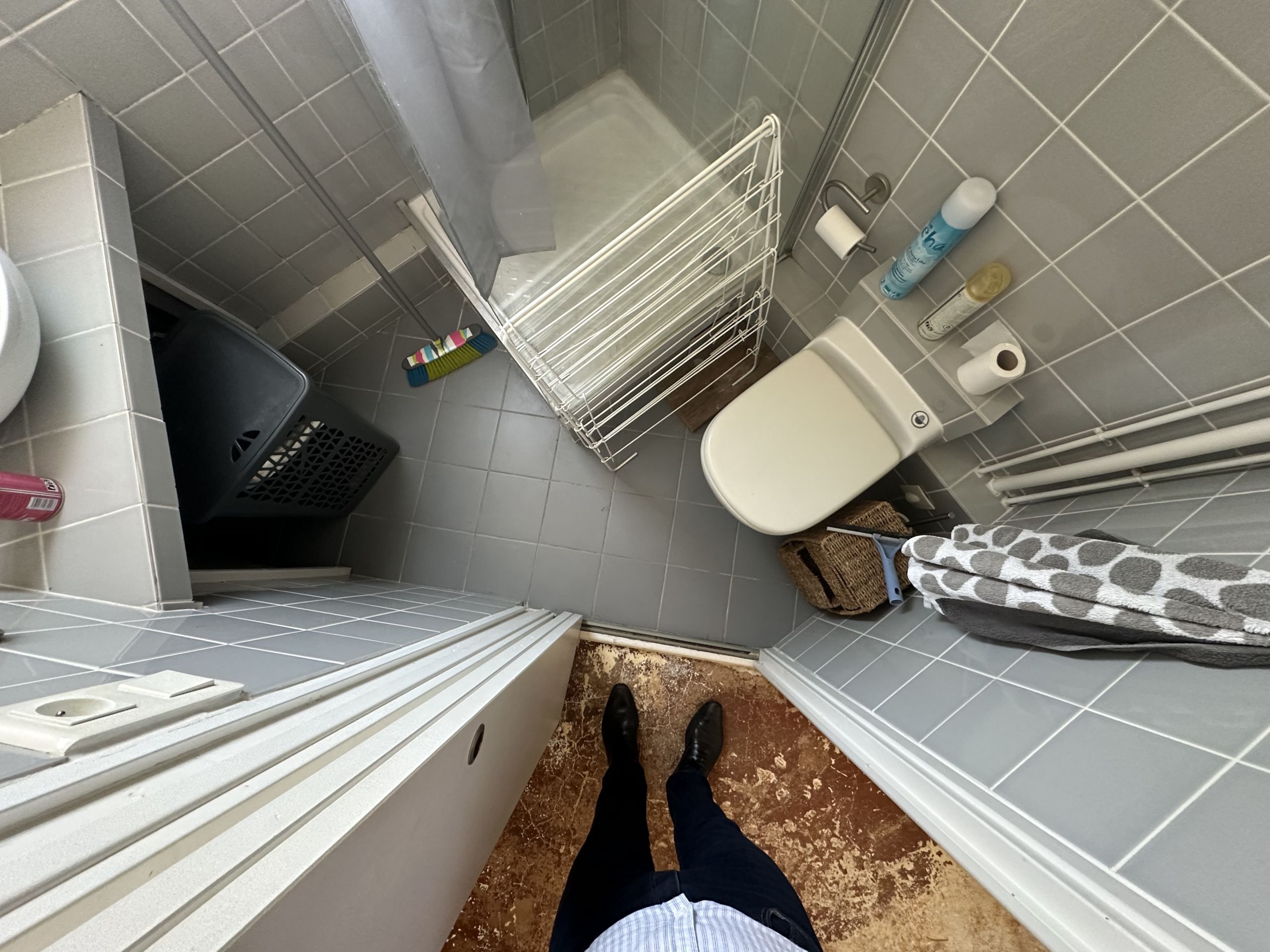 L’ensemble de la salle de bain est habillé d’un carrelage gris contemporain, qui apporte une touche de sobriété et de modernité à la pièce. Un ballon d’eau chaude performant assure un confort thermique optimal.