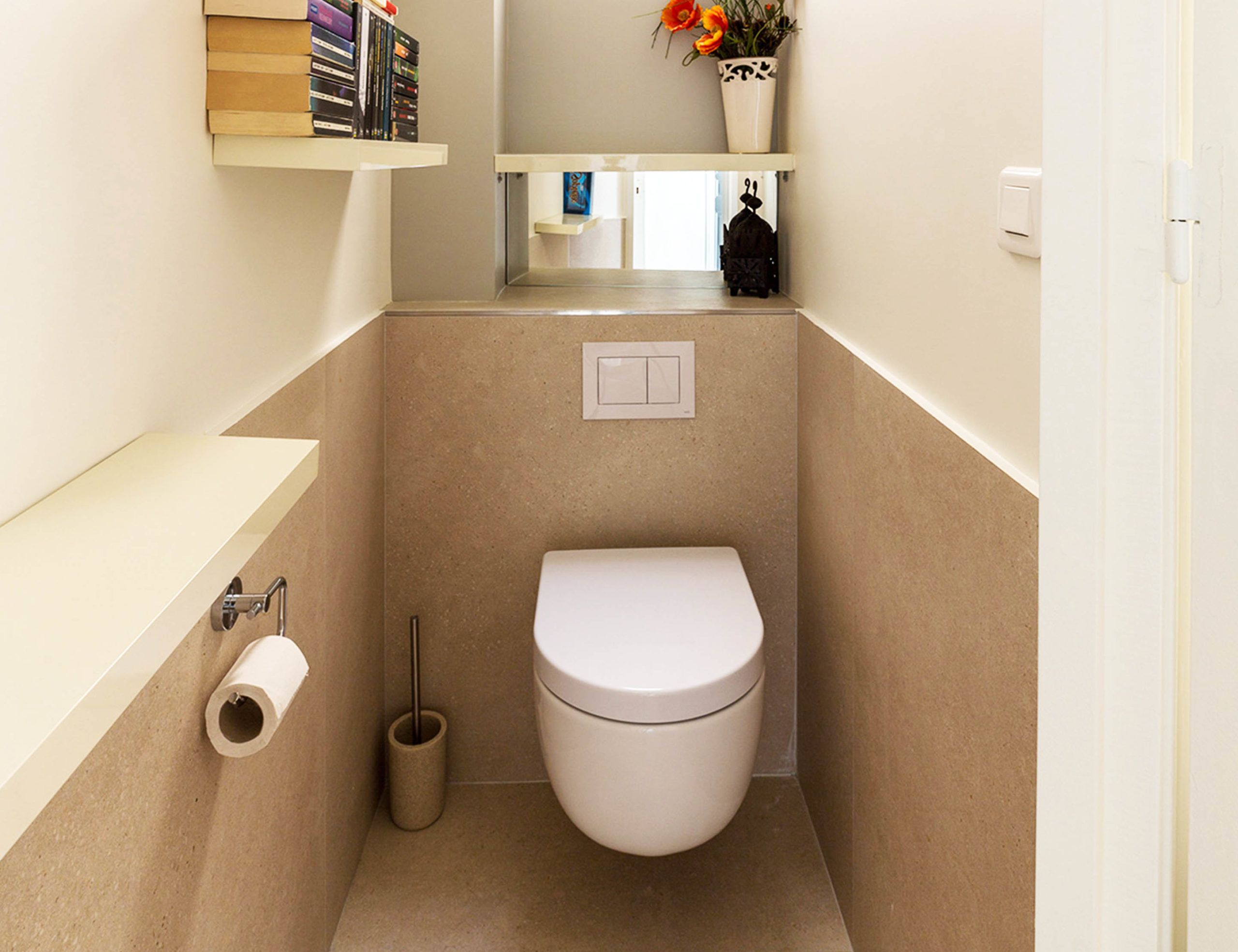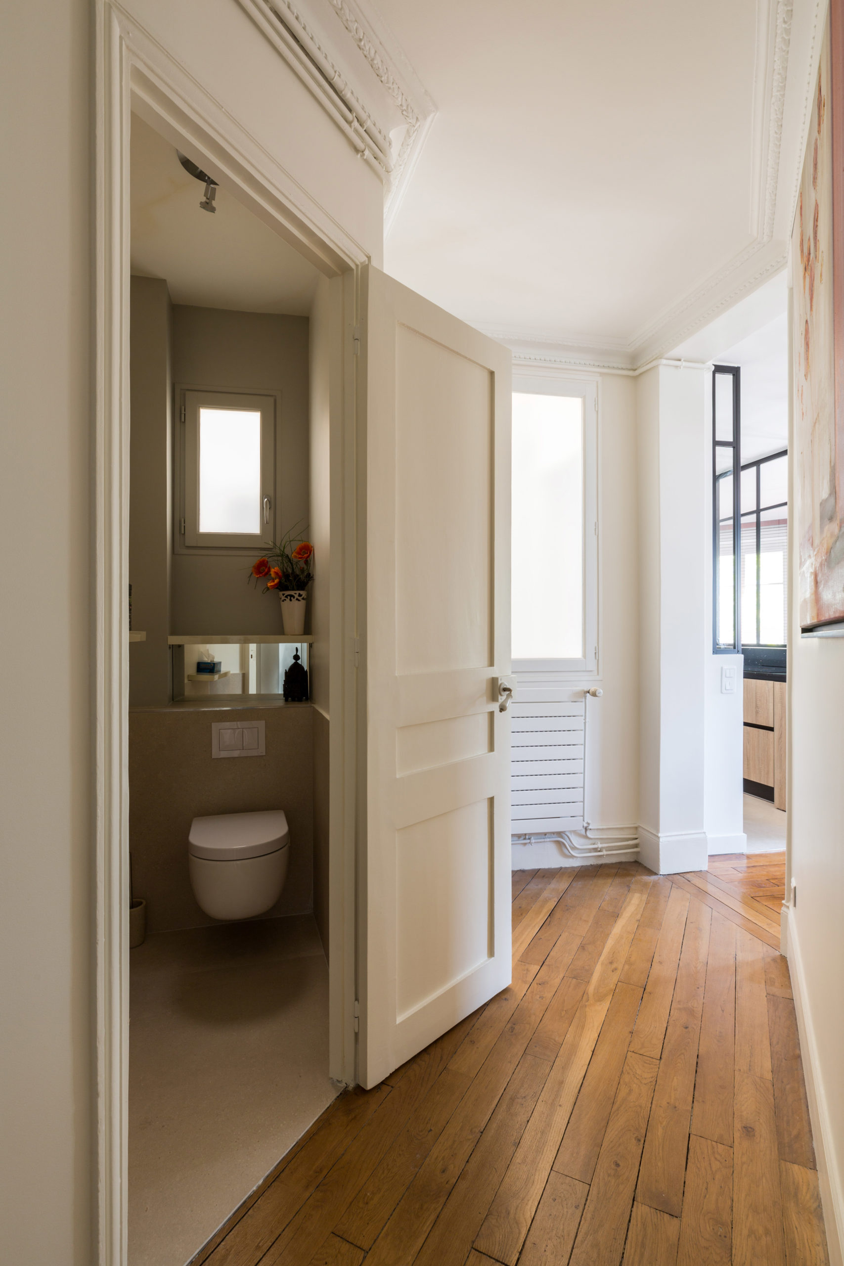 Puis, dans l’espace toilette nous avons déposé le WC au sol existant et remplacé par un WC suspendu. Ce qui est plus esthétique et facile d’entretien. Nous avons carrelé à hauteur du bâti et habillé les murs avec des tablettes laqués finition crème.