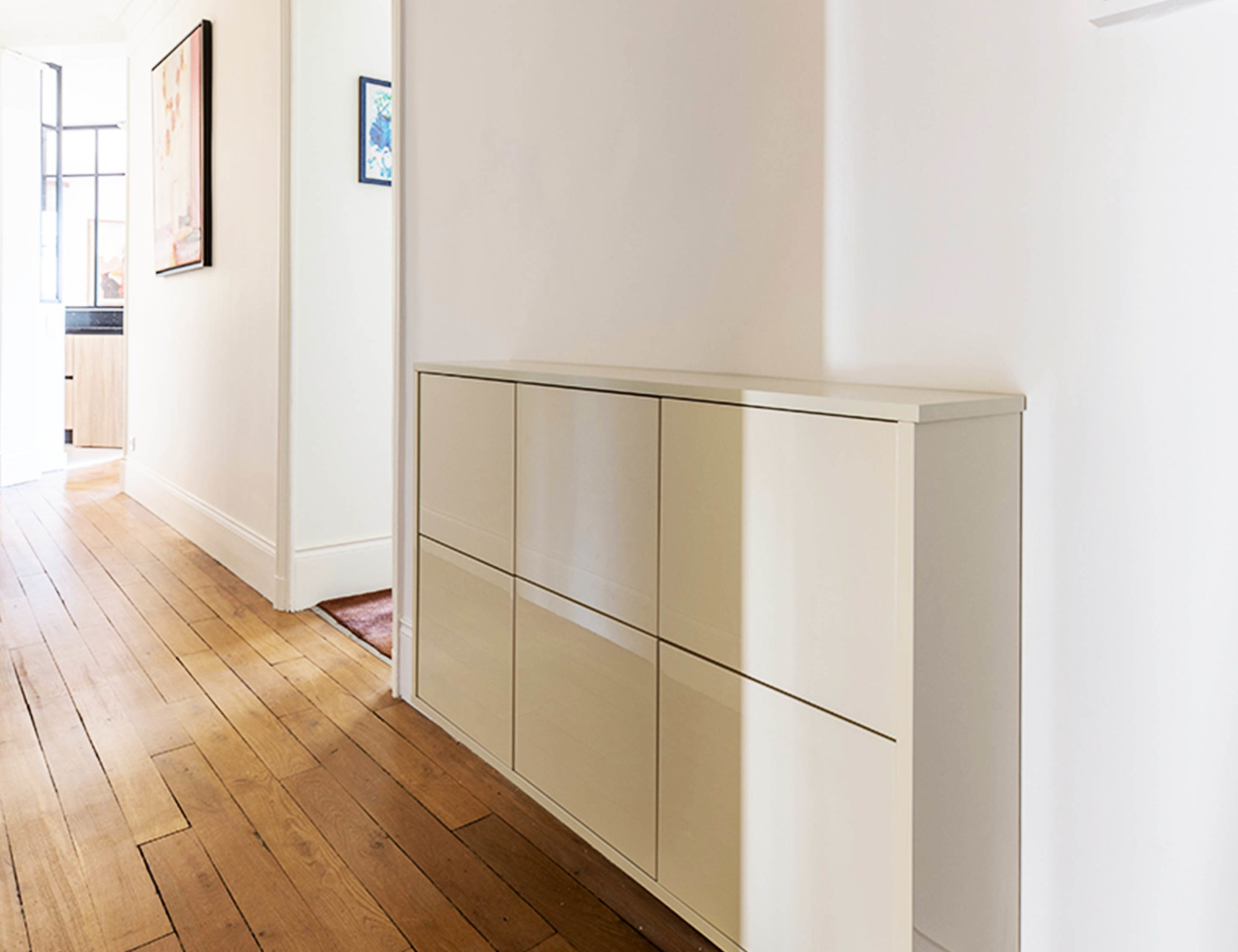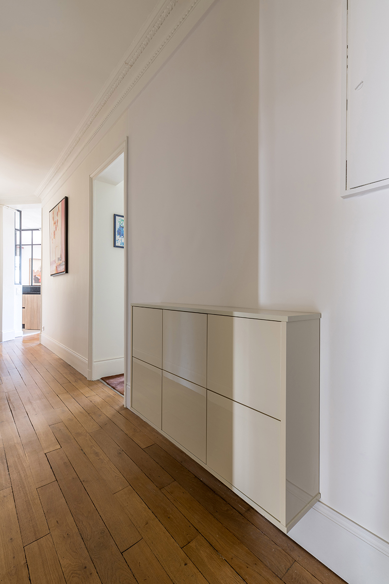 Dans l’entrée un beau meuble de rangement faible profondeur à été imaginé et fabriqué sur mesure. Cela est bien pratique pour poser les clés et autres éléments lorsqu’on rentre chez soi.
