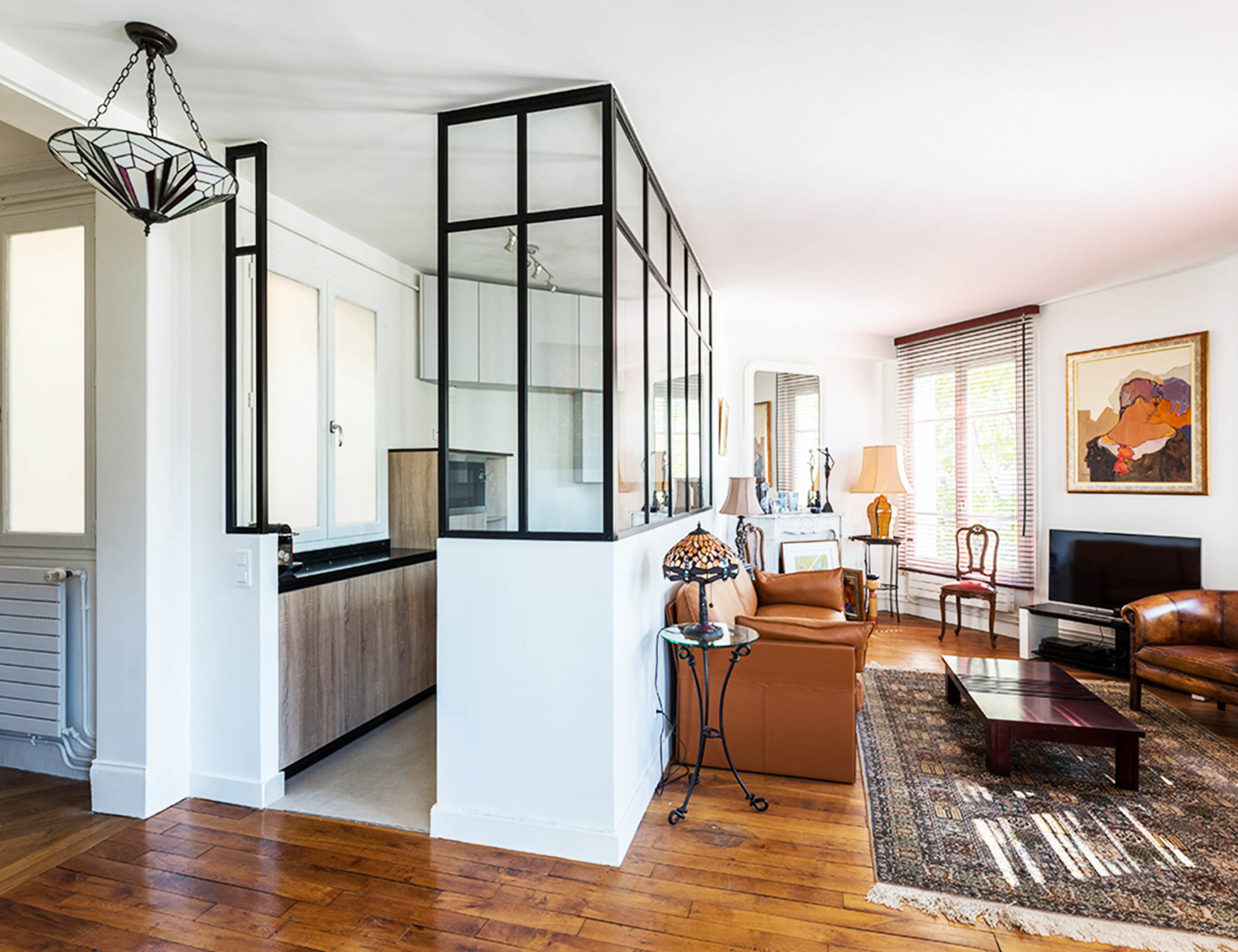 grande verrière style atelier. Ainsi, la lumière fuse des deux côtés de la cuisine et le client peut cuisiner tout en discutant avec ses invités.