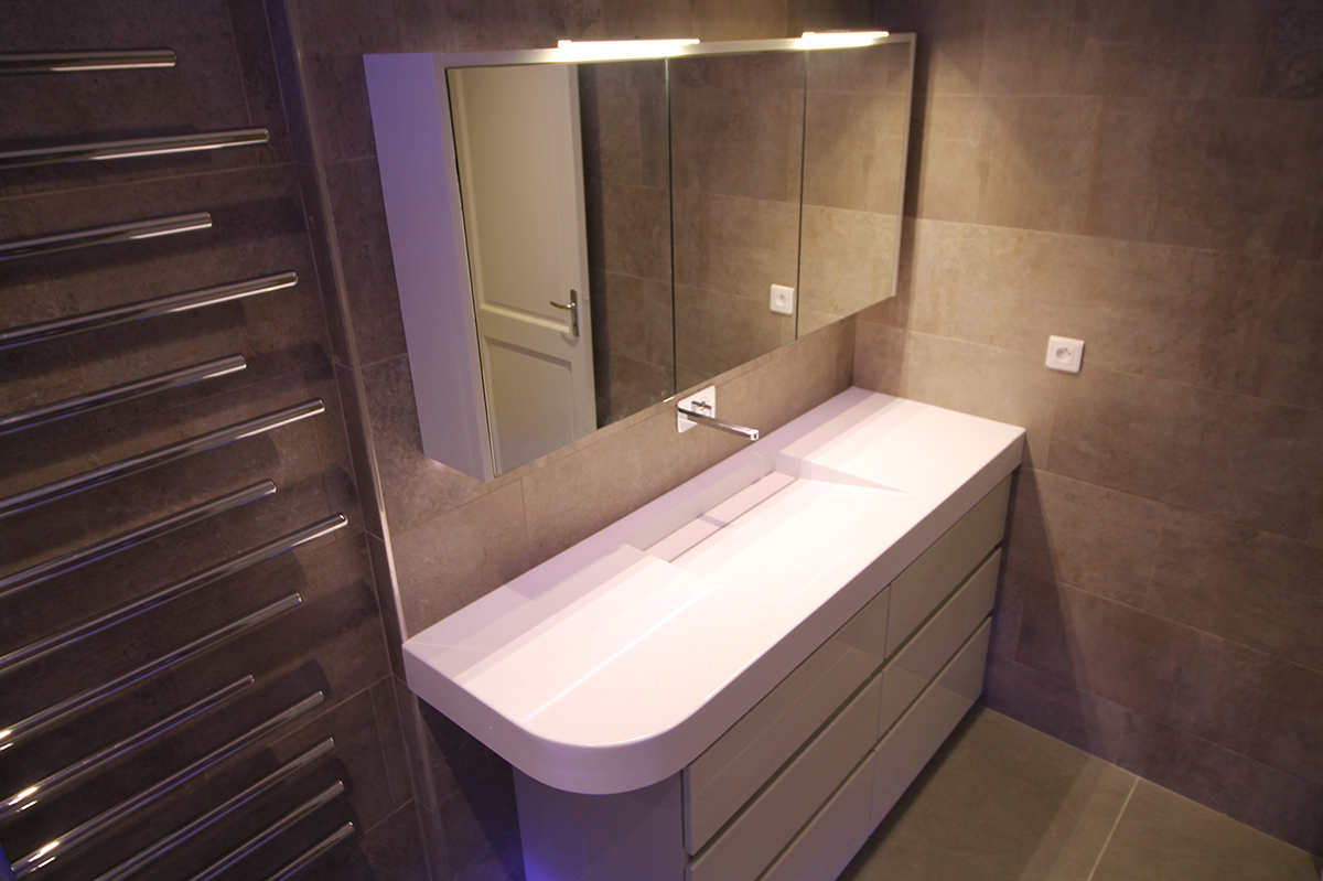 Dans l’entrée un grand meuble sous vasque 3 tiroirs à été créer avec un plan de toilette en corian sur mesure, en partie supérieure se trouve une grande armoire de toilette de 140cm de largeur x70cm de hauteur et permet de donner un effet de profondeur à la pièce.