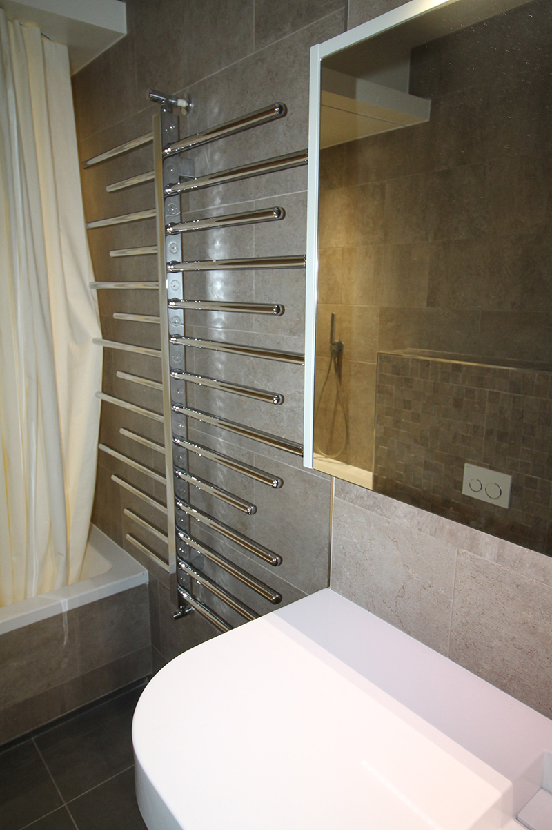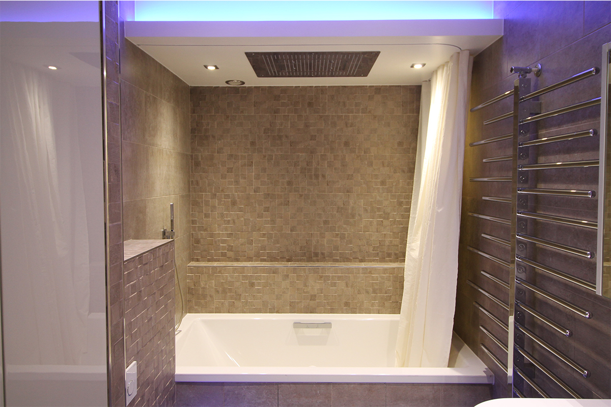 En partie supérieure un faux plafond avec une gorge lumineuse à été créer dans lequel il va contenir une rangée de spot lumineux et une belle dalle de tête de 80x60cm (petite astuce nous avons dissimulé le rail de rideau de douche en l’encastrant dans le faux plafond) Un magnifique radiateur chromé en épi a été choisi et sublime cette salle de bain.