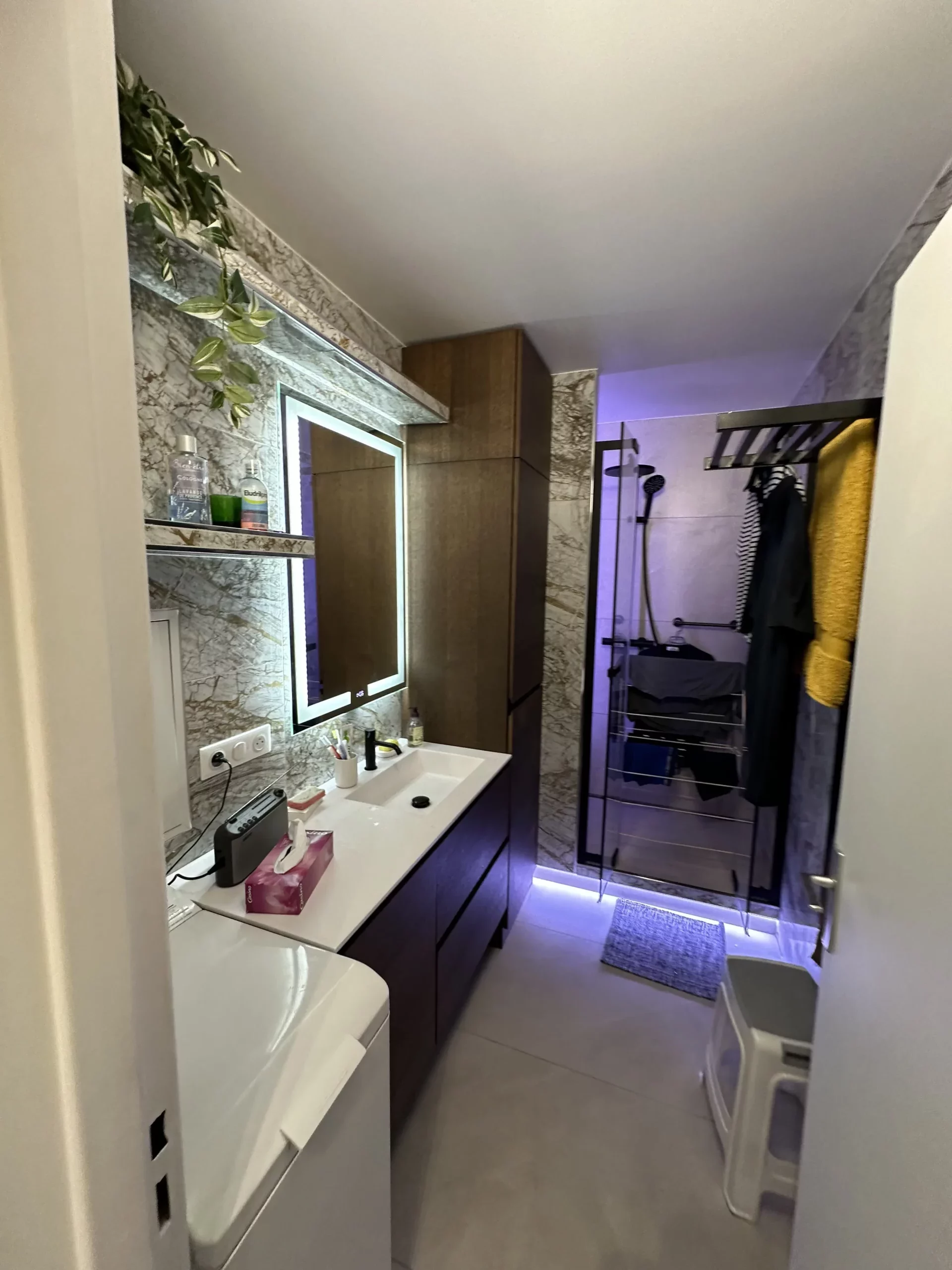 Découvrez une salle de bain élégante et optimisée, conçue pour allier design contemporain et confort quotidien. Nous intervenons à Paris, Neuilly-sur-Seine, Levallois-Perret, Boulogne-Billancourt et Clichy pour réaliser des aménagements sur mesure, adaptés à vos besoins.