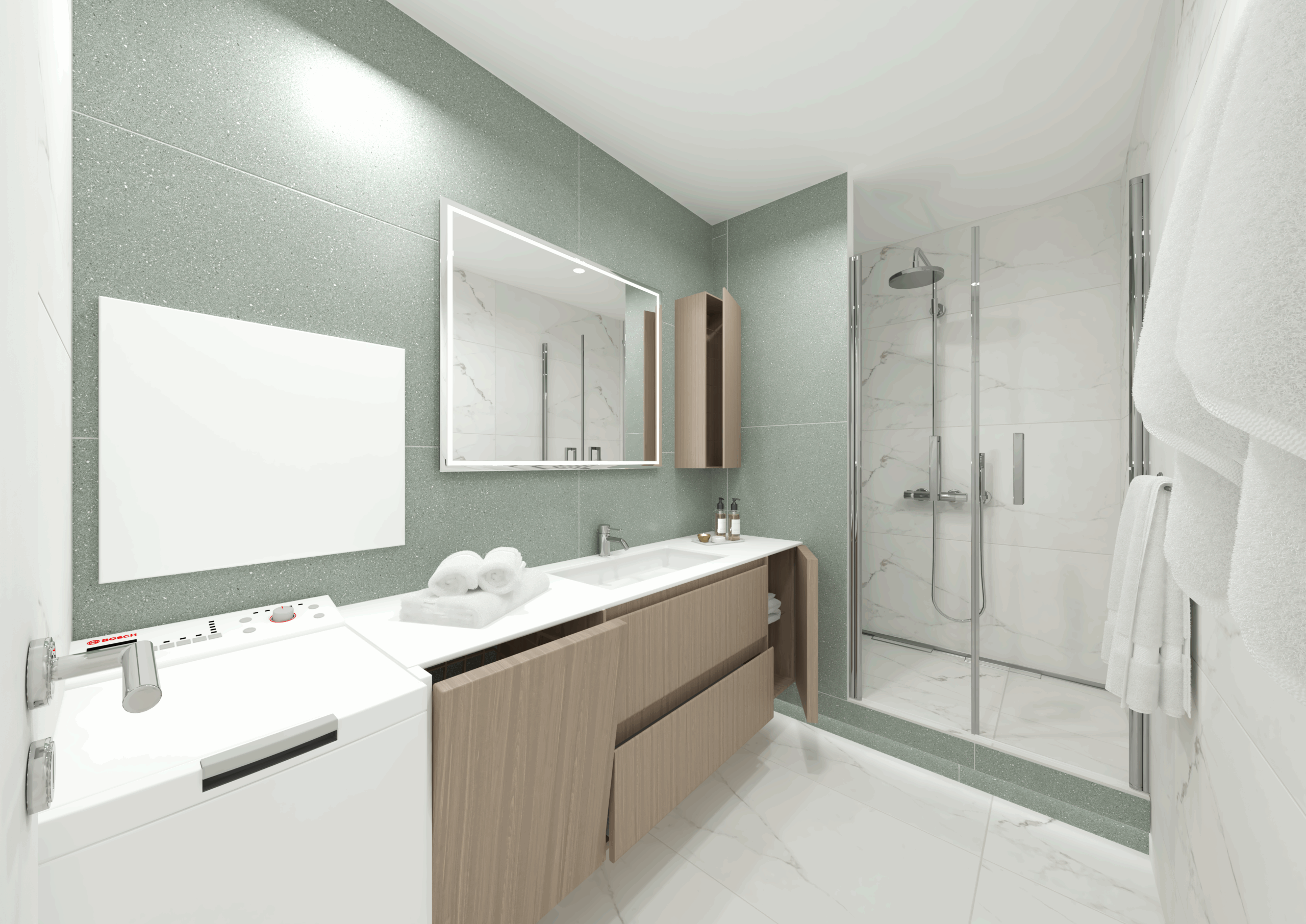 - Machine à laver discrètement intégrée, pour une buanderie invisible et efficace.