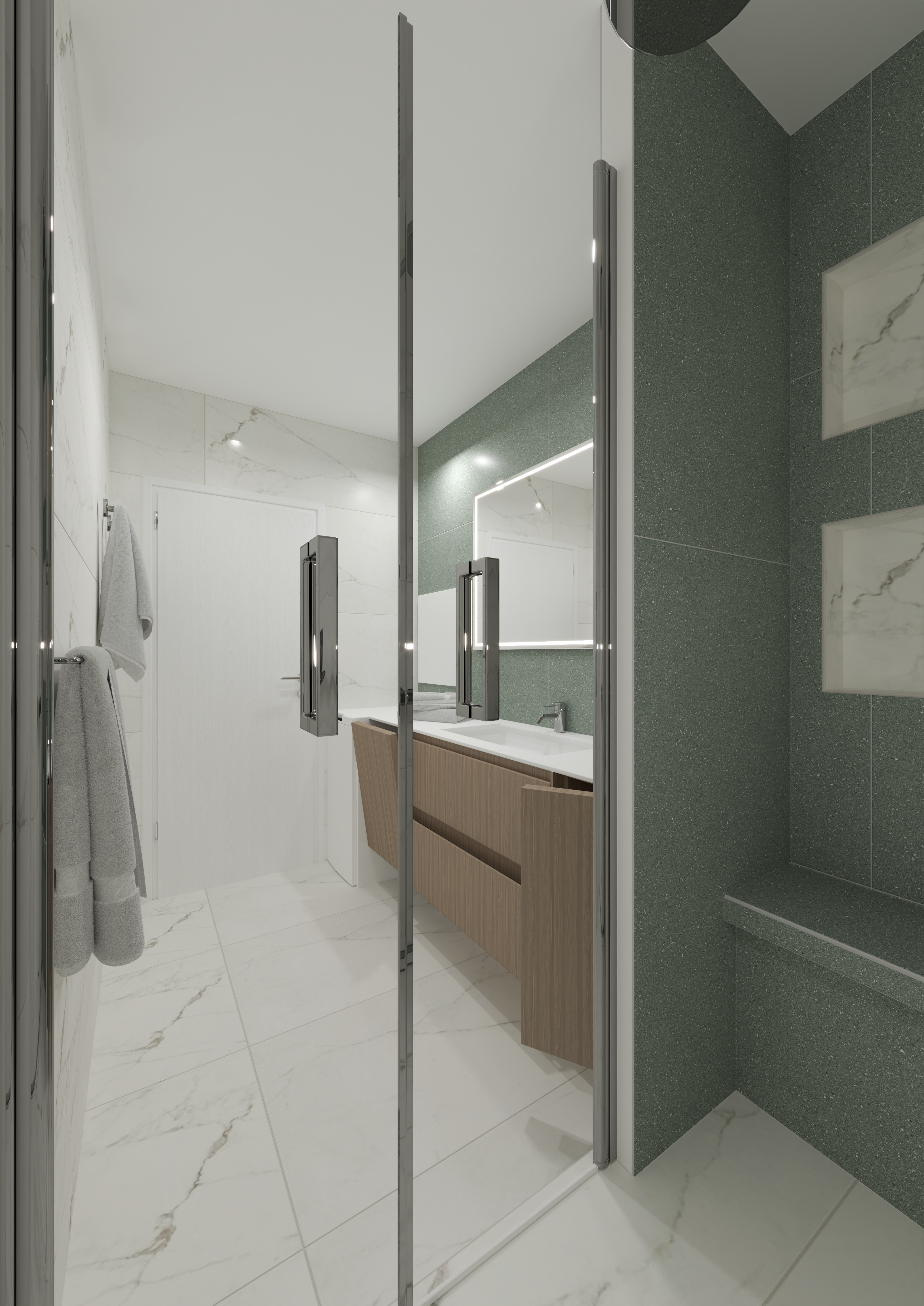 - Carrelage effet marbre, apportant une touche luxueuse et intemporelle.