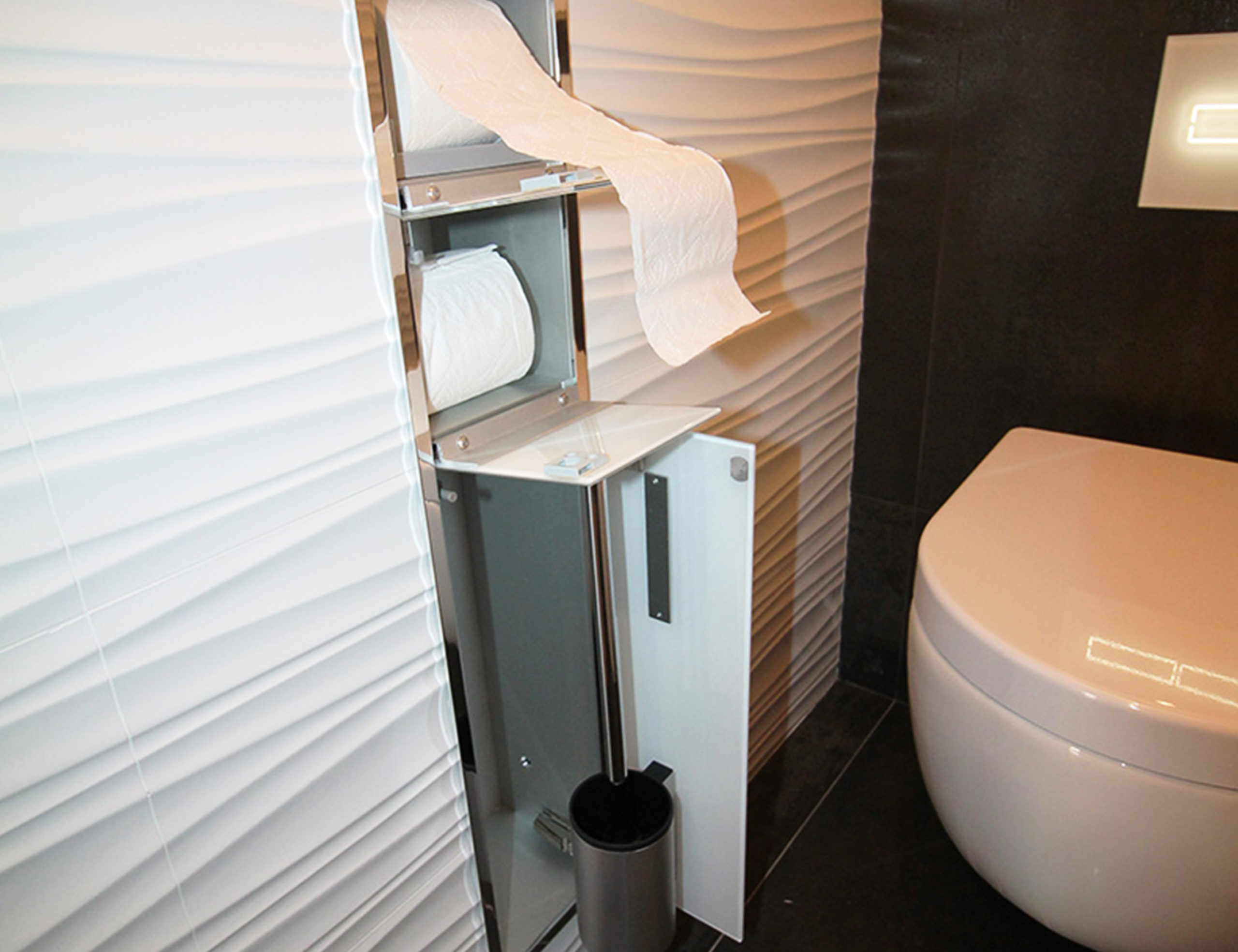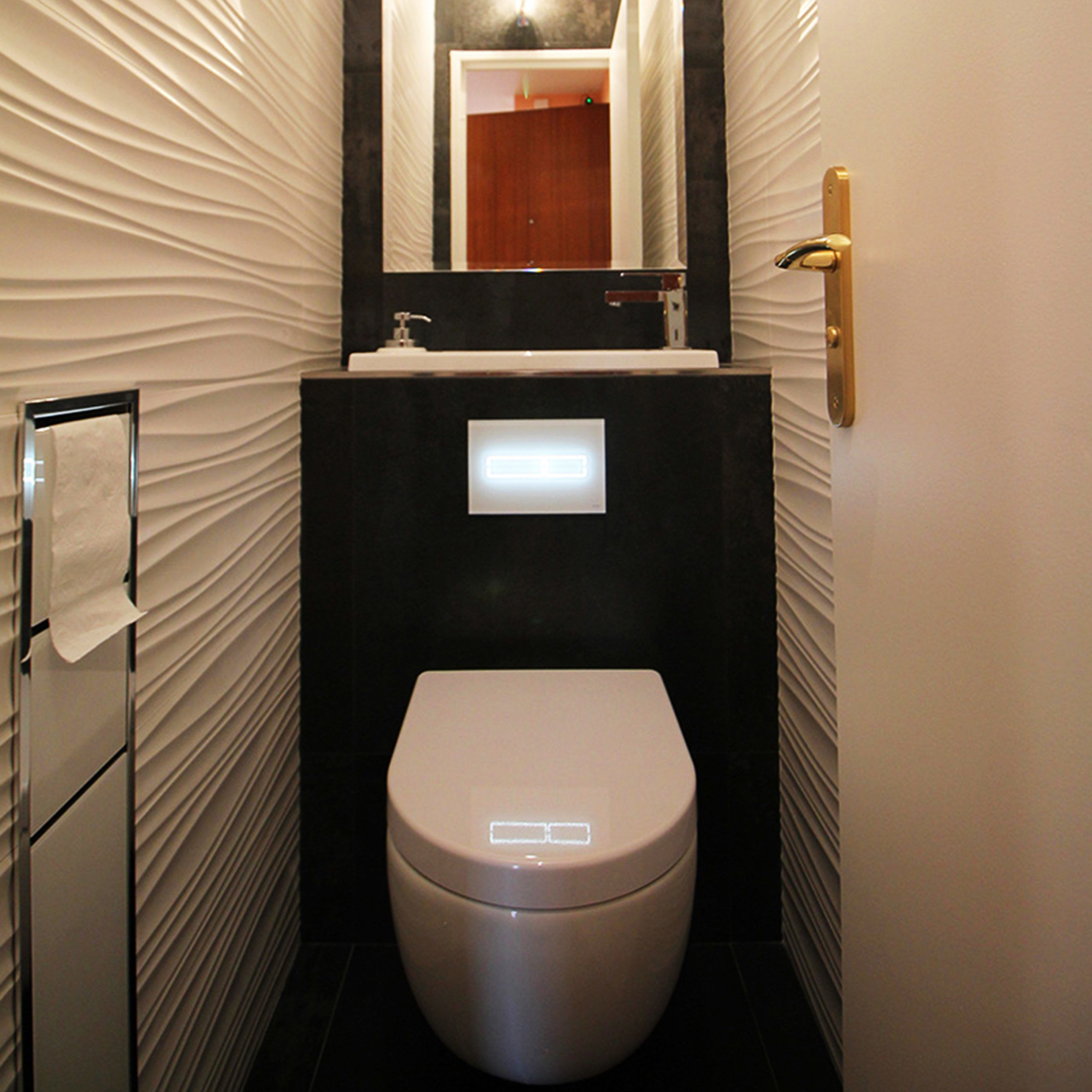 Sur les murs adjacents nous avons choisi du carrelage en relief effet « wave » pour apporter du dynamisme à la pièce. Enfin un cabinet de toilette encastré dans le mur à été installé pour ranger le papier et la brosse de toilette.