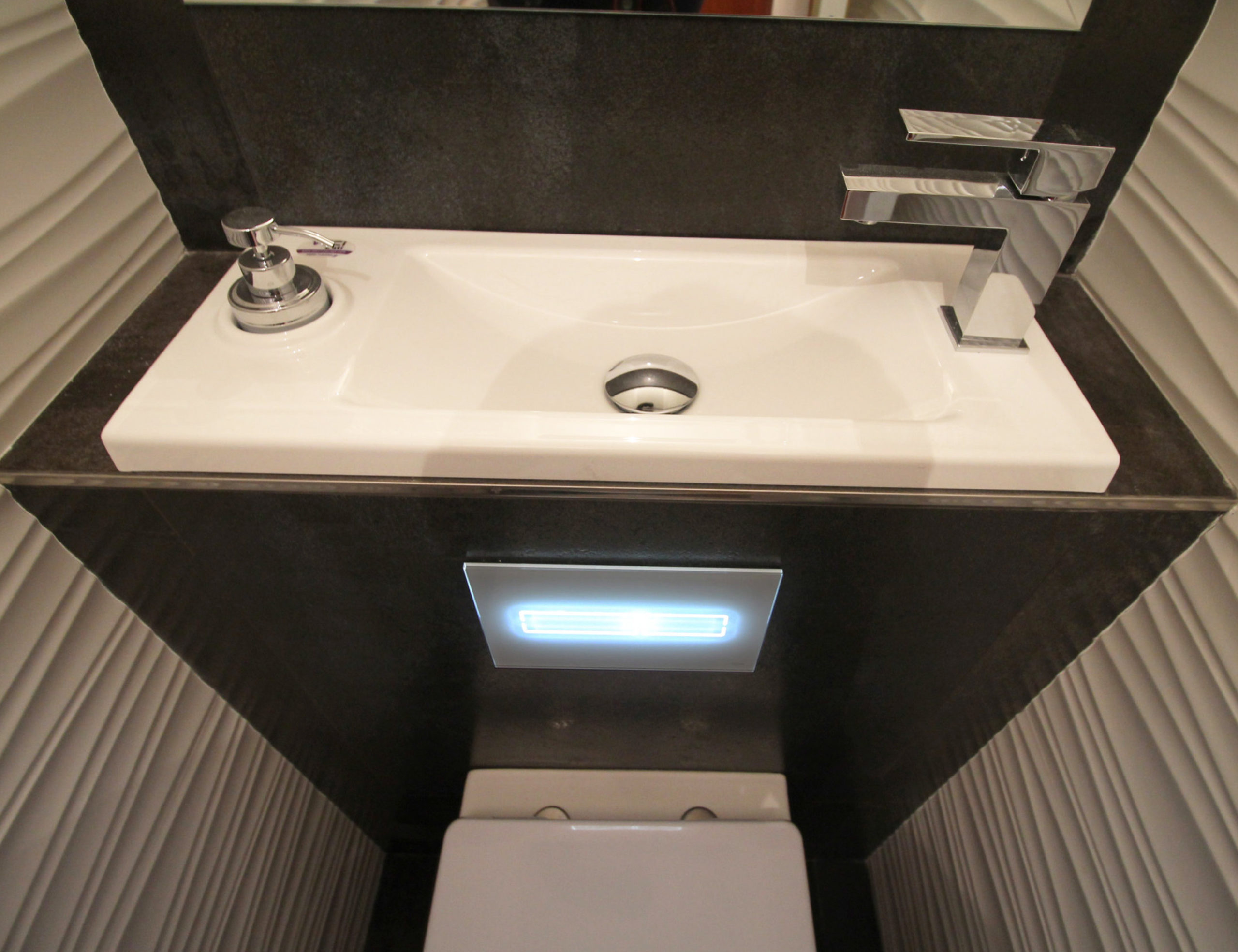 Lave main design Wici concept. Cuvette et abattant CLOU. Au sol et murs carrelage de chez Porcelanosa. Plaque de commande infrarouge TECE. Cabinet de toilette encastrable façade verre finition blanc EMCO.