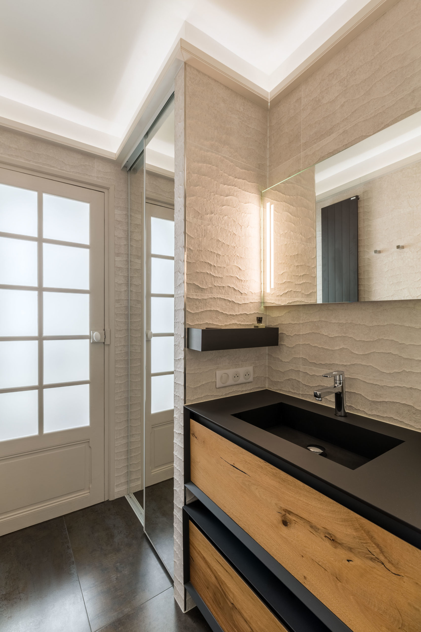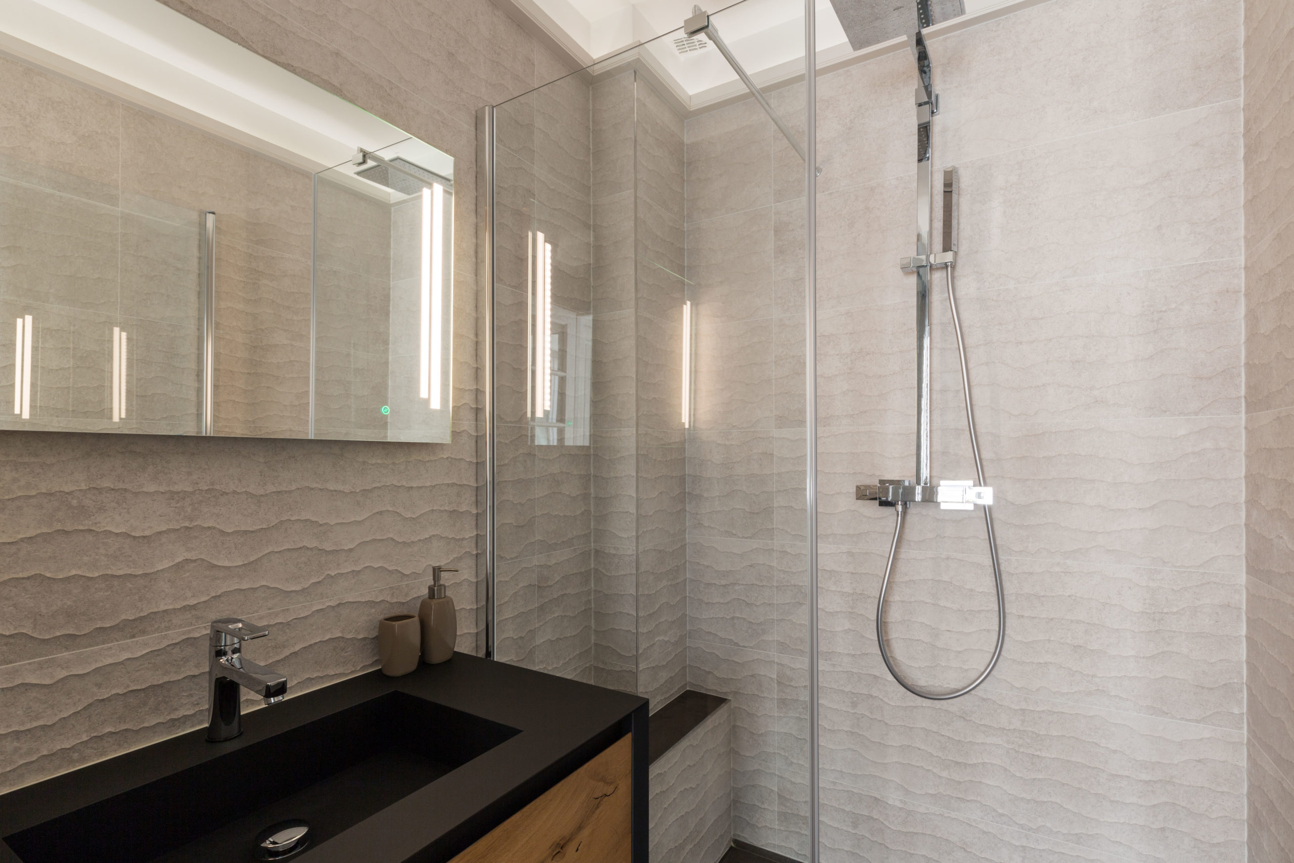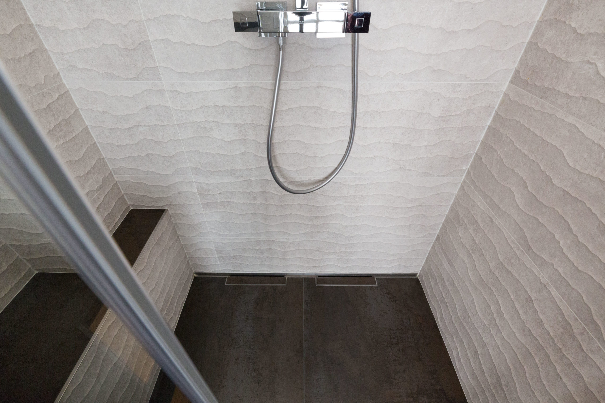 Pour ce projet, notre client souhaitait enlever la baignoire pour gagner une grande douche à l’italienne avec 2 commandes séparées et un ciel de pluie intégré. Le défi était d’obtenir une salle de douche de plein pied pour y intégrer l’évacuation de l’eau et un chauffage au sol.