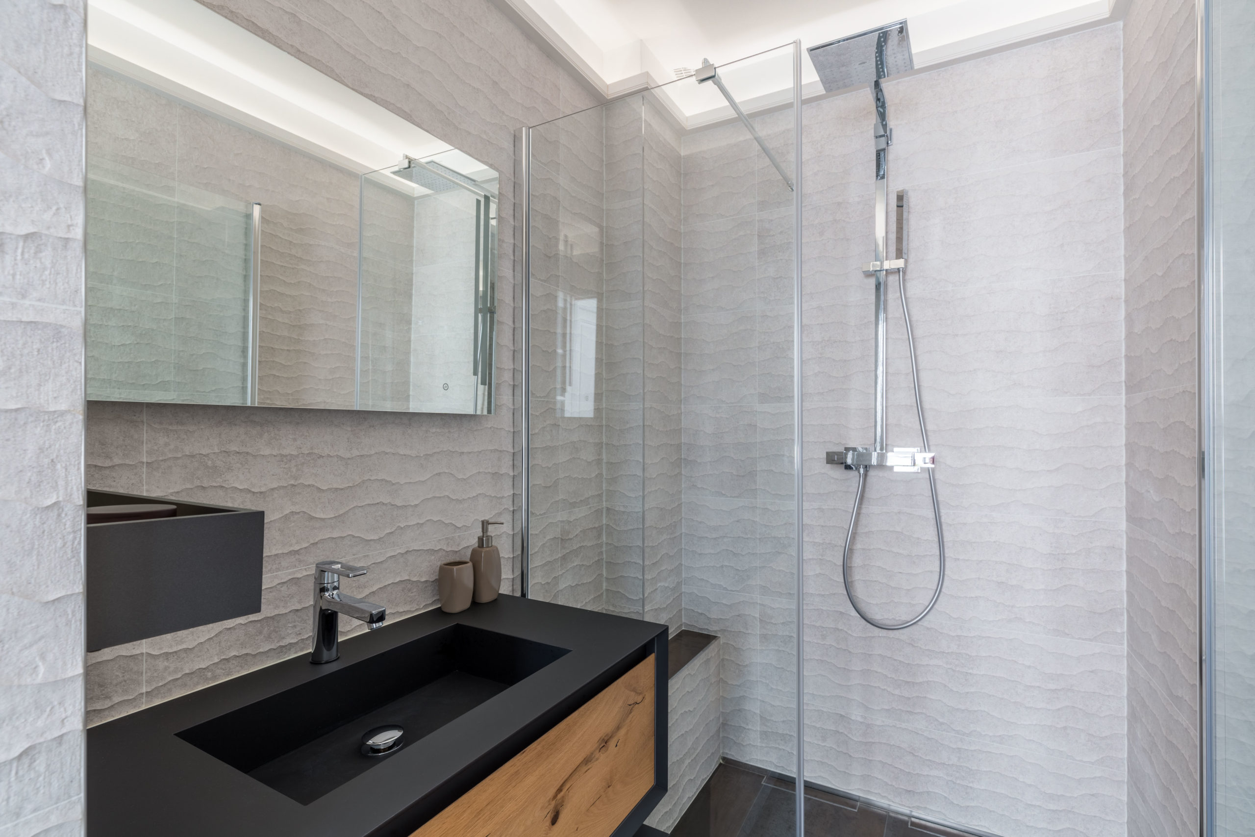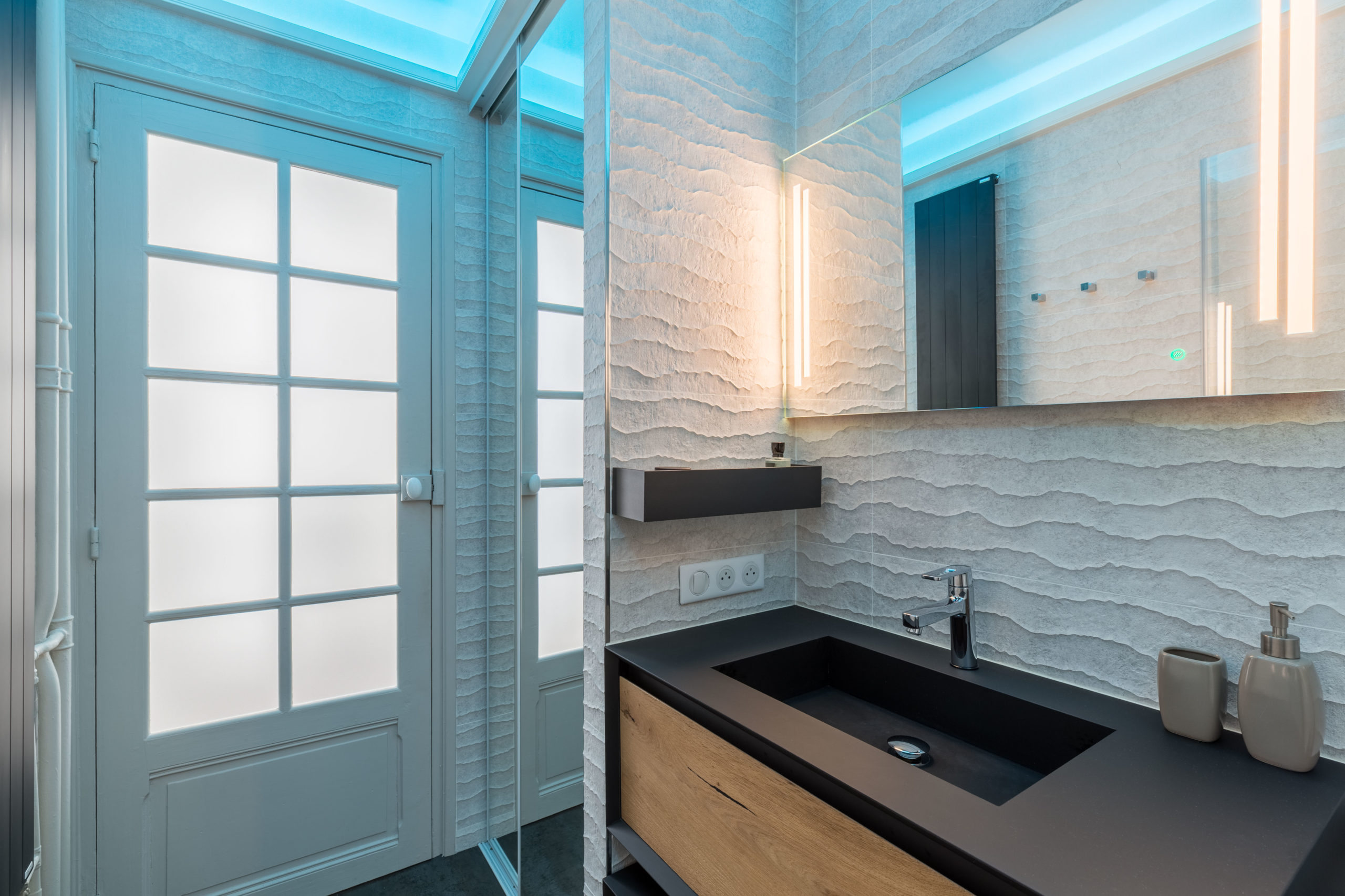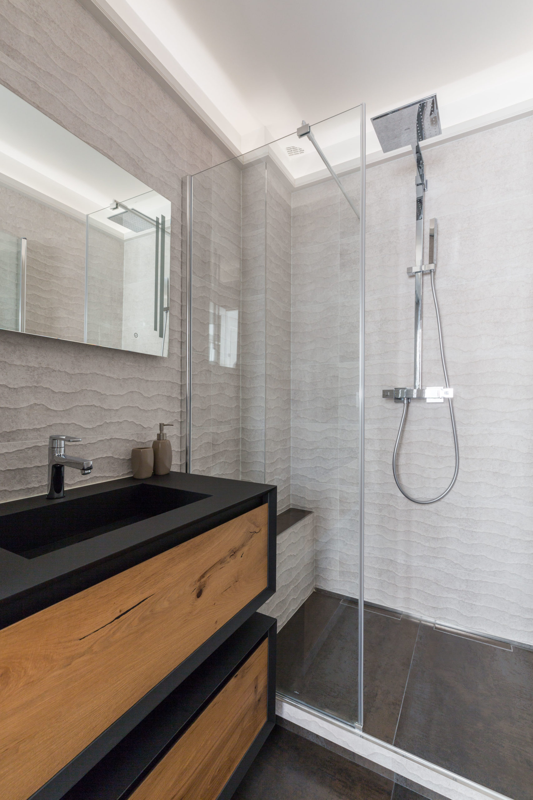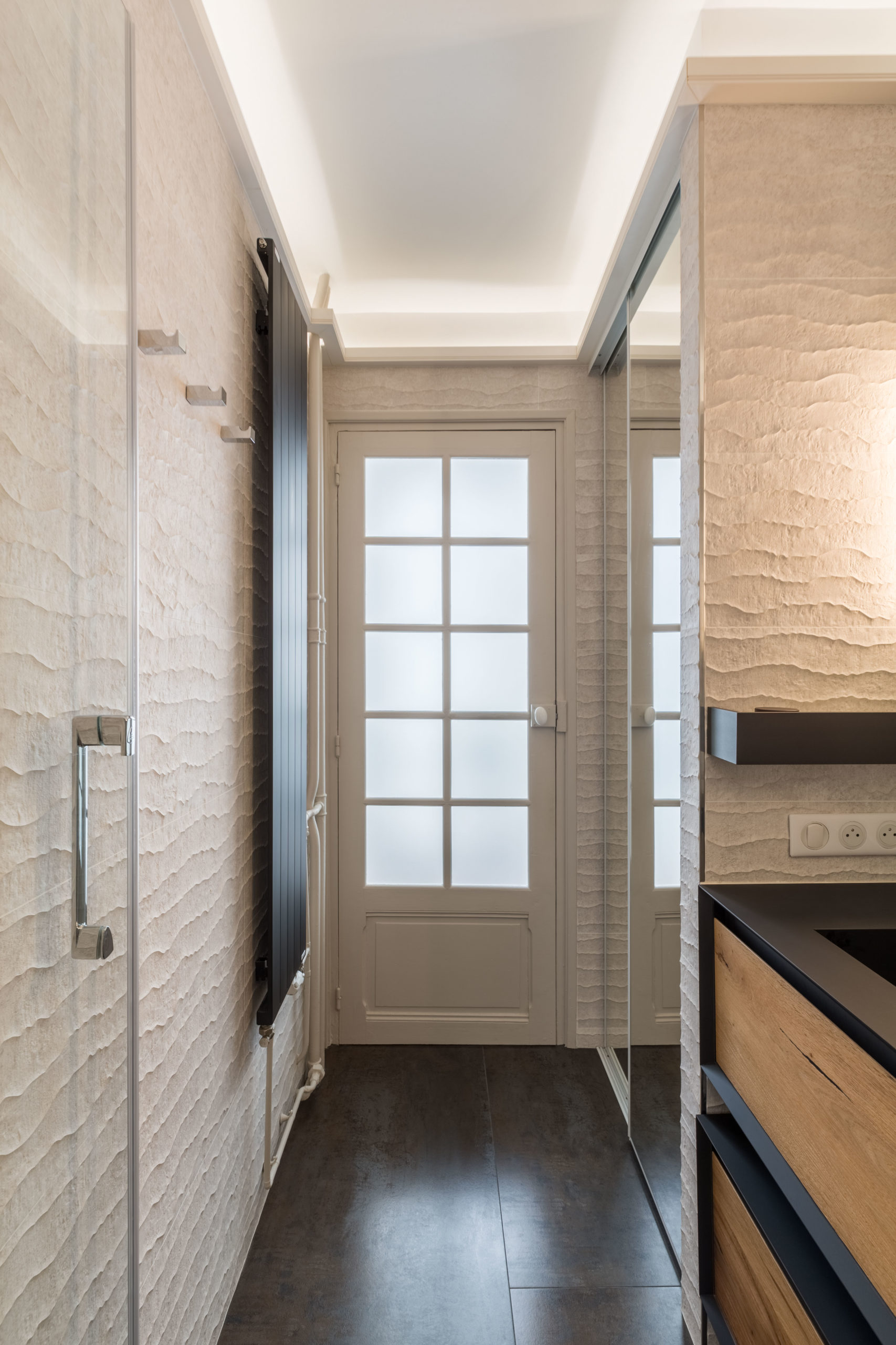 Pour ce projet, notre client souhaitait enlever la baignoire pour gagner une grande douche à l’italienne avec 2 commandes séparées et un ciel de pluie intégré. Le défi était d’obtenir une salle de douche de plein pied pour y intégrer l’évacuation de l’eau et un chauffage au sol.