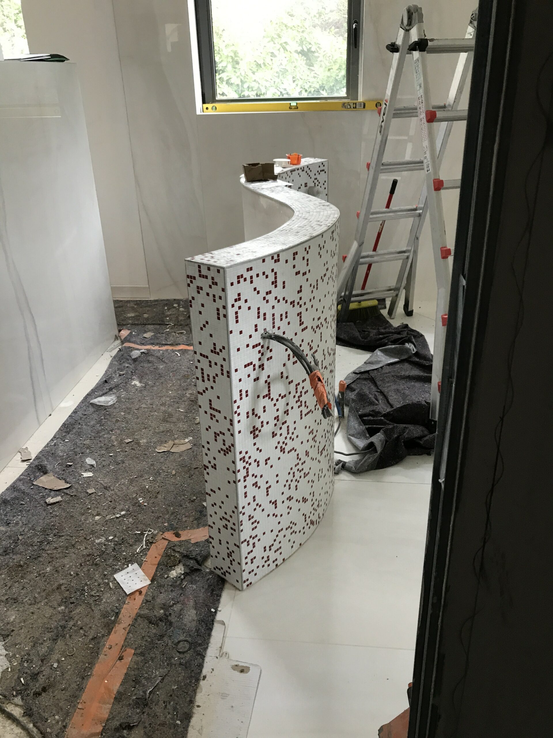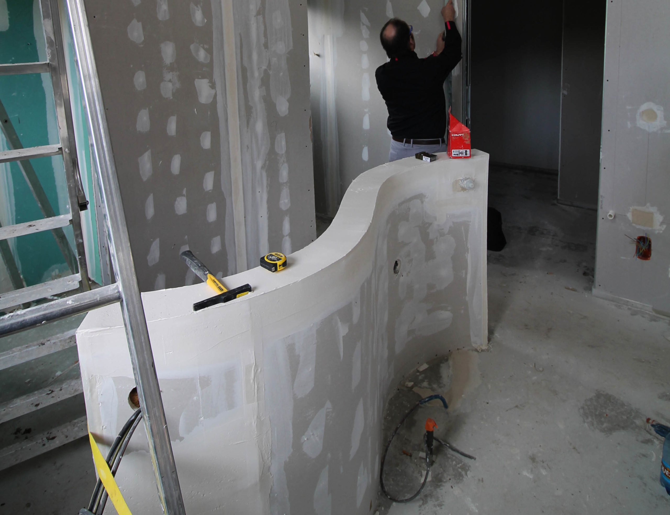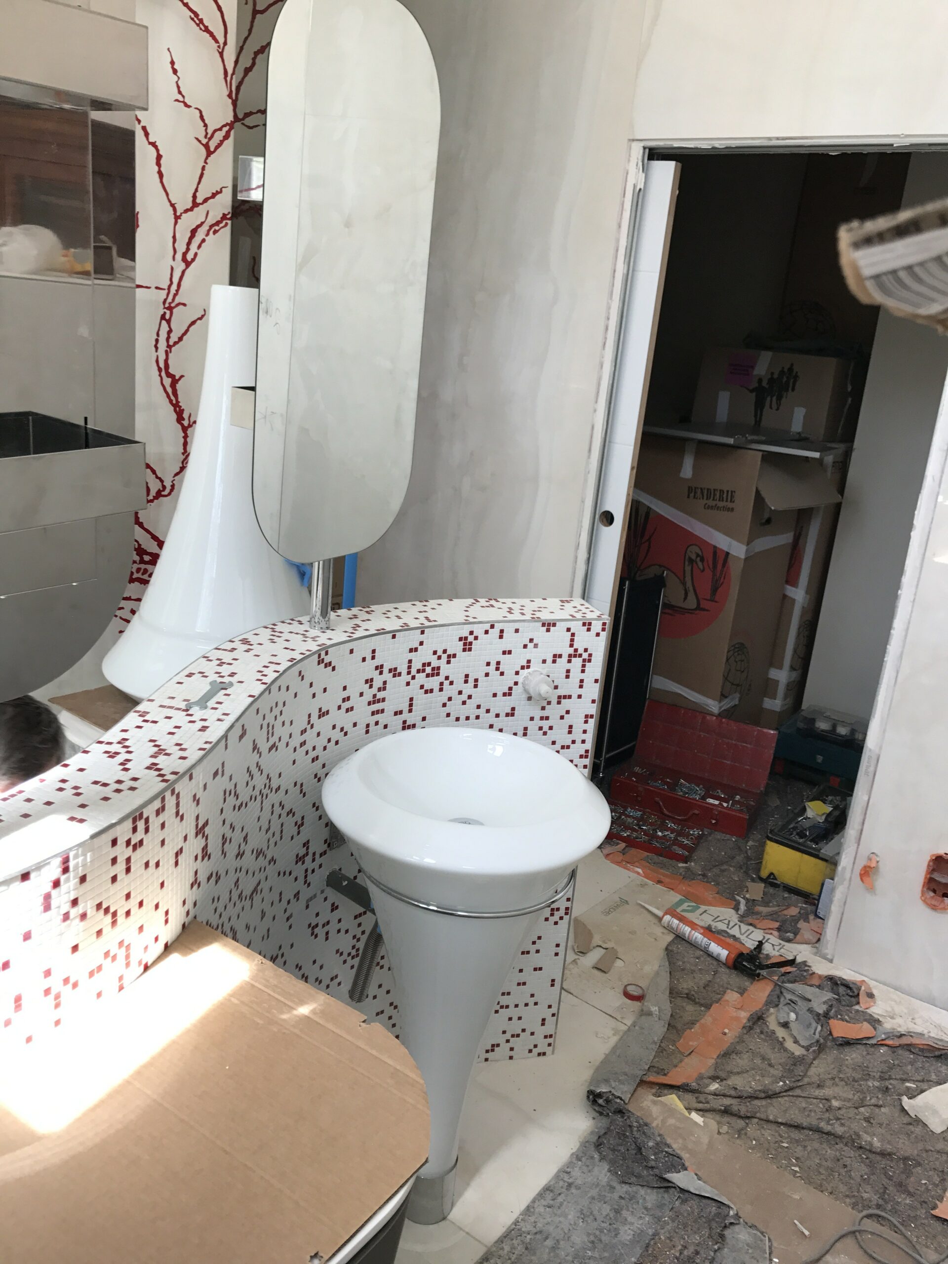 Découvrez la conception unique de cette salle de bain dans une chambre créée, et cela tout en arrondi ! Un meuble particulier avec sa forme en dollar… un concept original et un défi relevé par les Bains&Cuisines d’Alexandre.