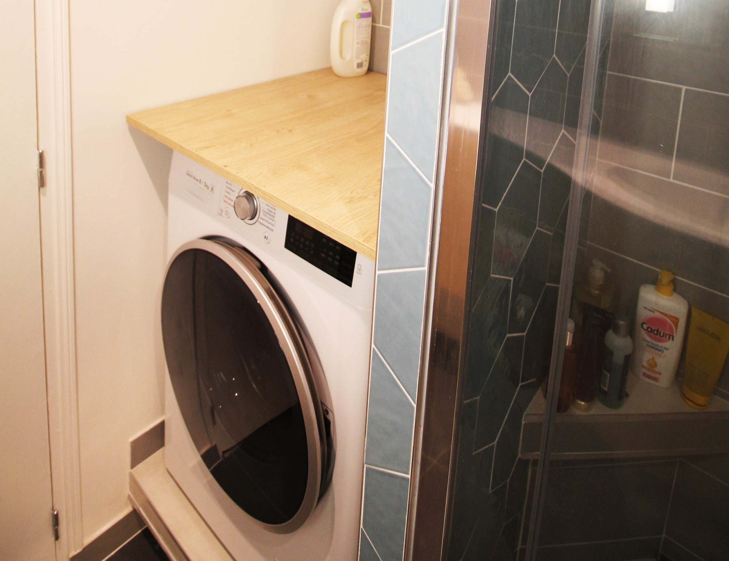 La complexité de ce projet résidait dans le fait que nous devions conserver 3 pans de murs carrelés ainsi que le sol. De ce fait, la salle de douche a été entièrement réorganisée. Ainsi, nous avons surélevé le sol en créant une marche et contremarche. Cela permet d’accueillir une douche plus spacieuse, un WC suspendu et l’espace buanderie. Celui-ci a été dissimulé afin de rendre la pièce plus esthétique.