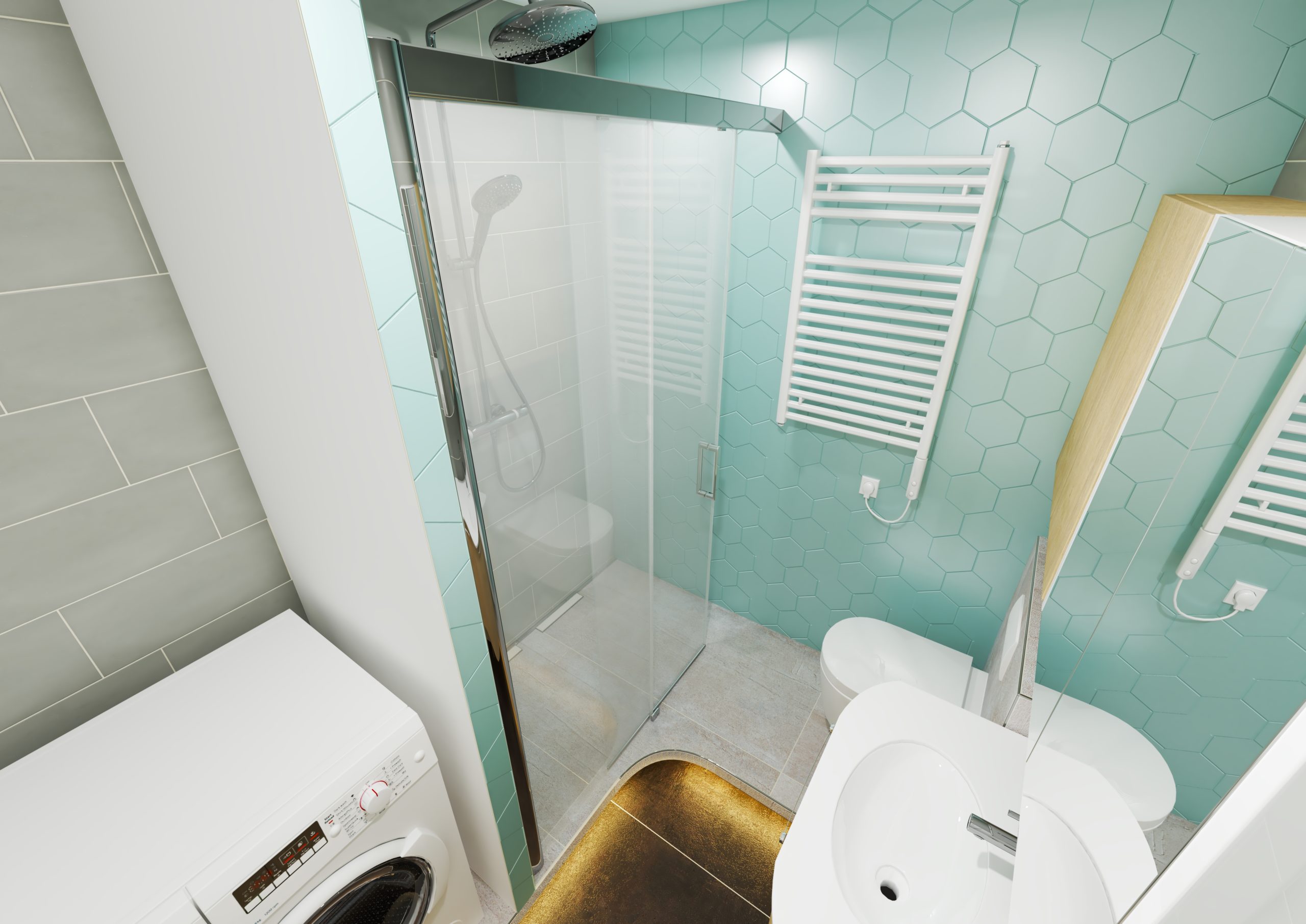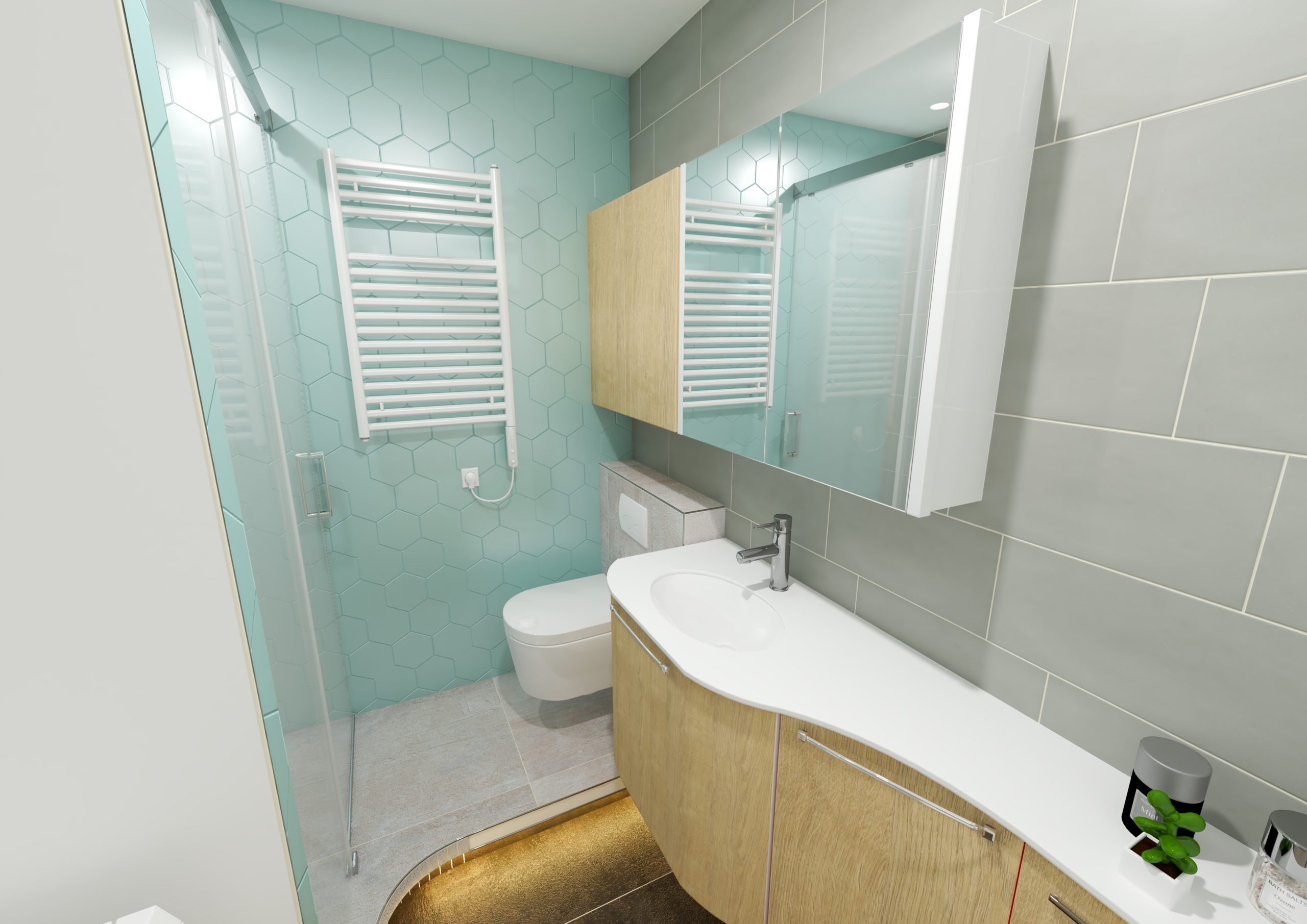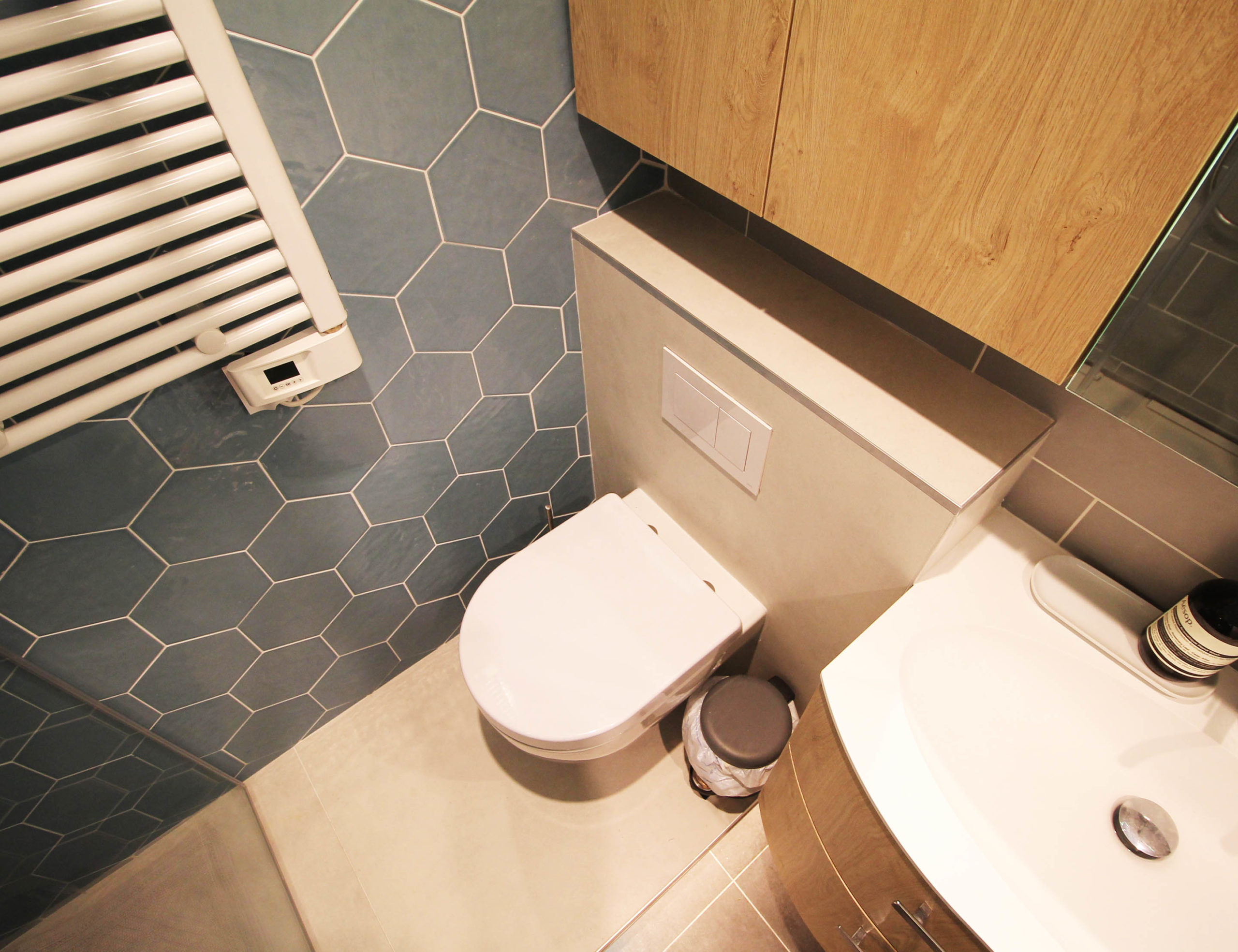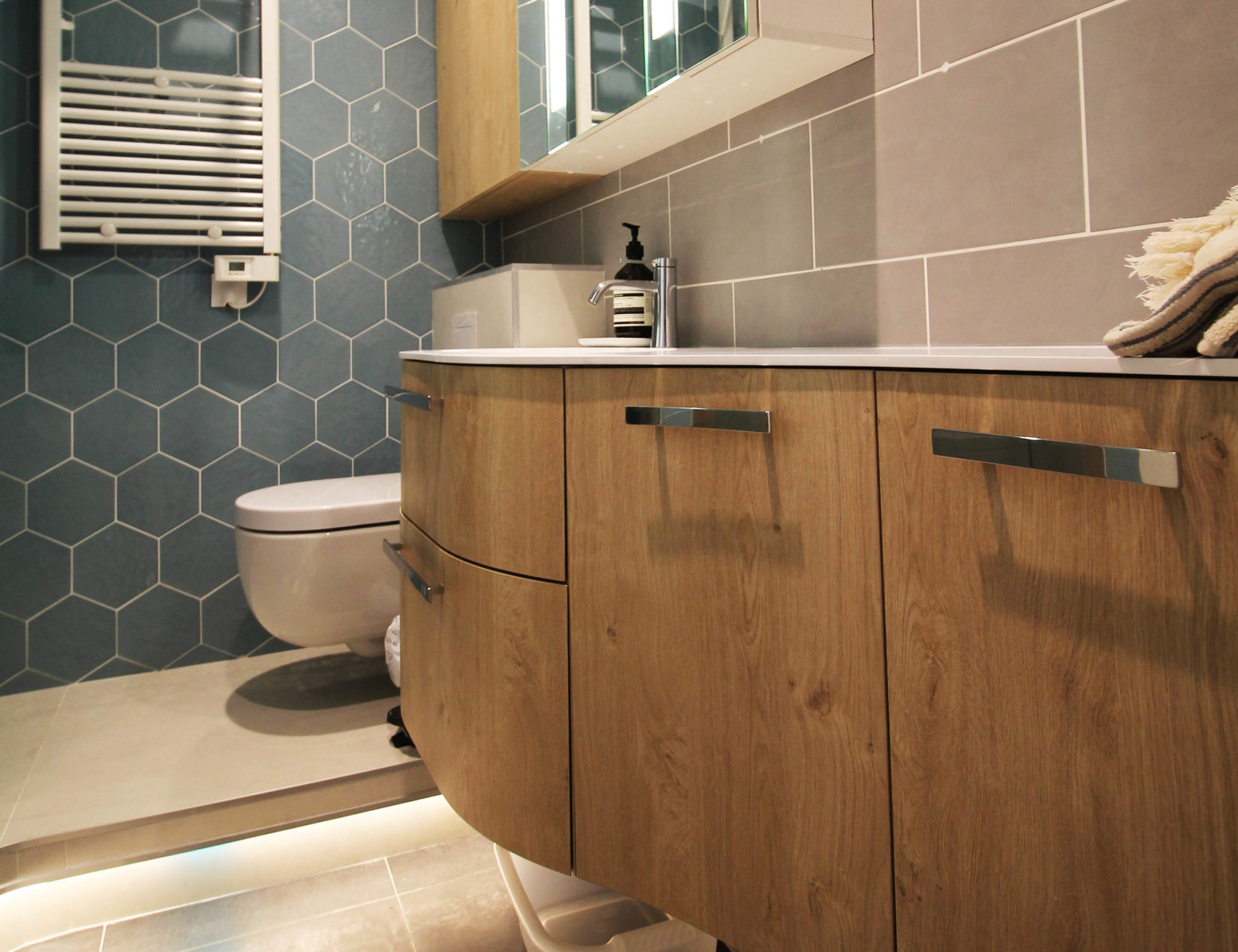 Côté design, nous avons opté pour des formes arrondies et galbées qui composent le meuble, la forme du sol de douche, ainsi que le WC. Cela apporte plus de modernité et d’harmonie à la pièce. Enfin, nous avons conservé l’armoire de toilette existante (éclairage intégré) et ajouté un meuble de rangement sur-mesure situé au-dessus du WC. Nous avons gardé la même profondeur entre les deux meubles, afin de garder une uniformité dans l’ameublement. Le mur du fond a été habillé avec un carrelage hexagonal bleu-vert menthe.