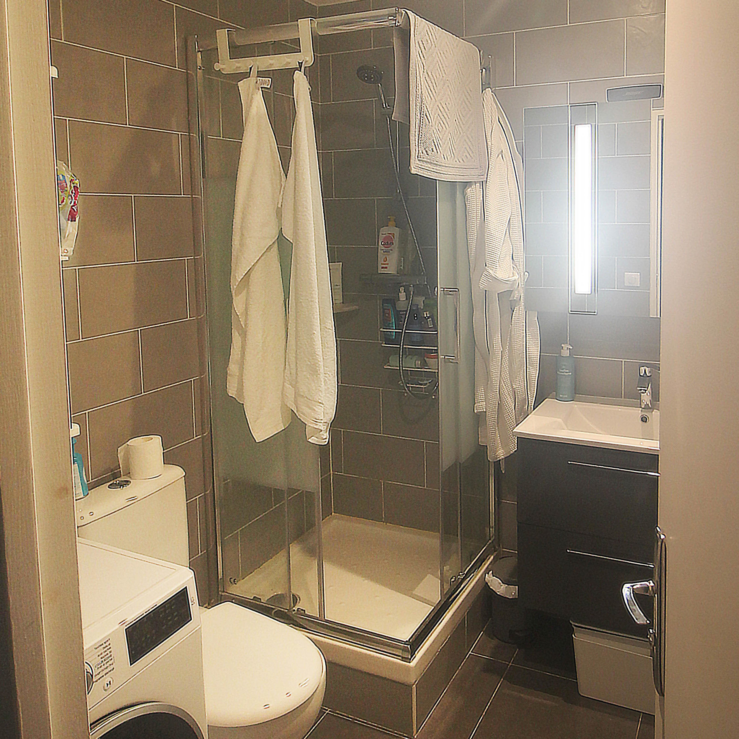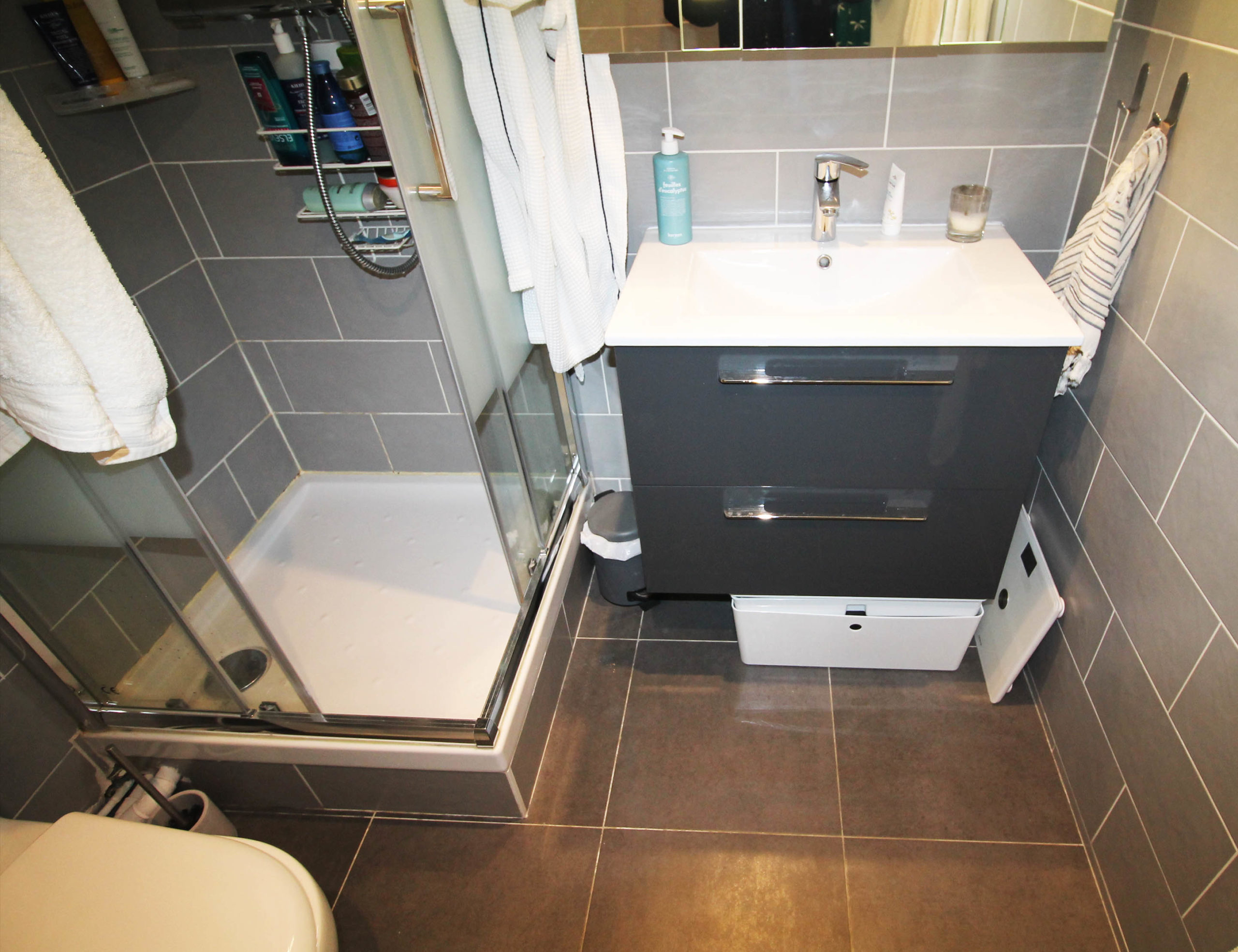 Nos clients ayant acquis récemment cet appartement souhaitaient travailler l’aménagement de la salle de douche. En effet, ils cherchaient une douche plus confortable, et un espace de rangement suffisant.