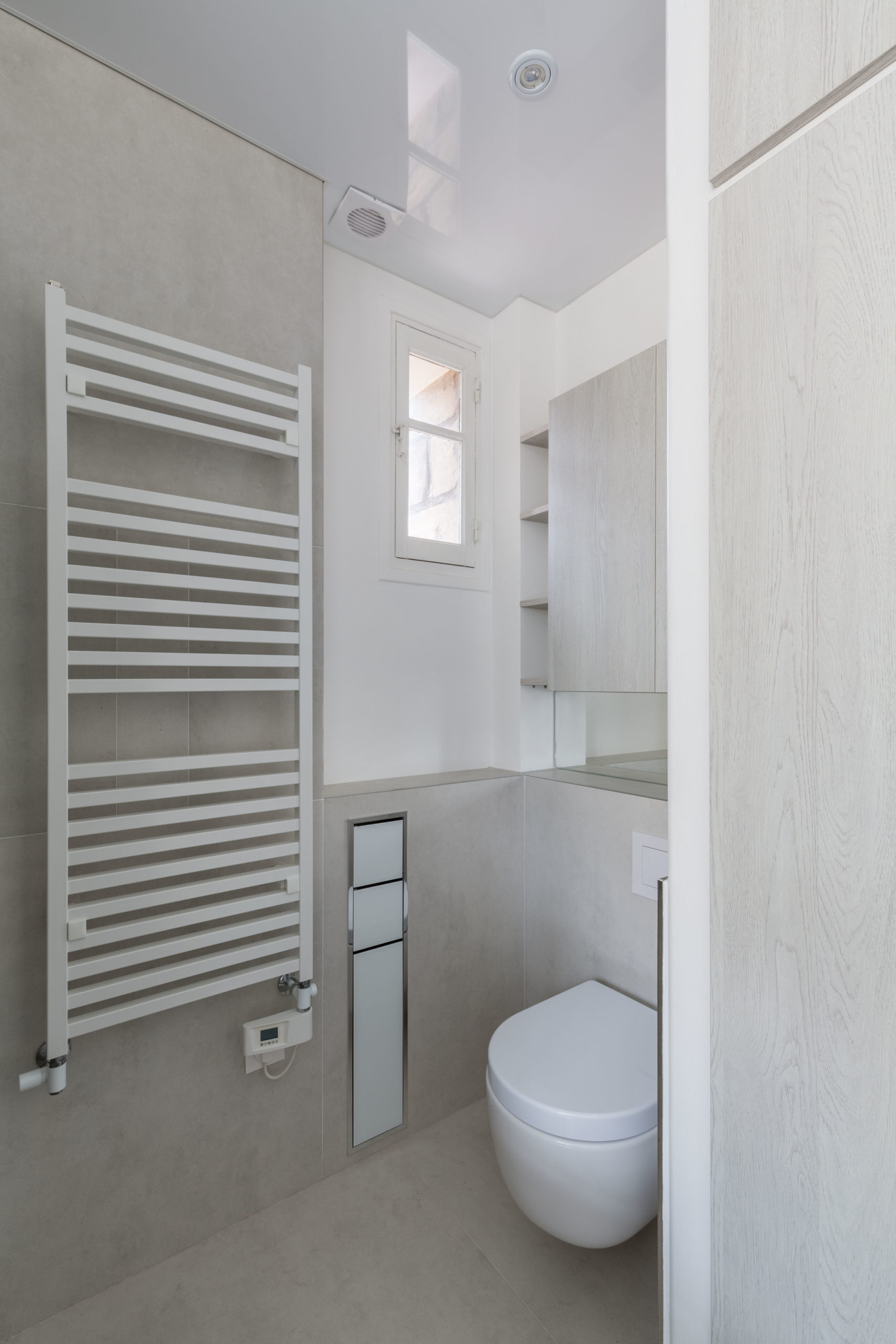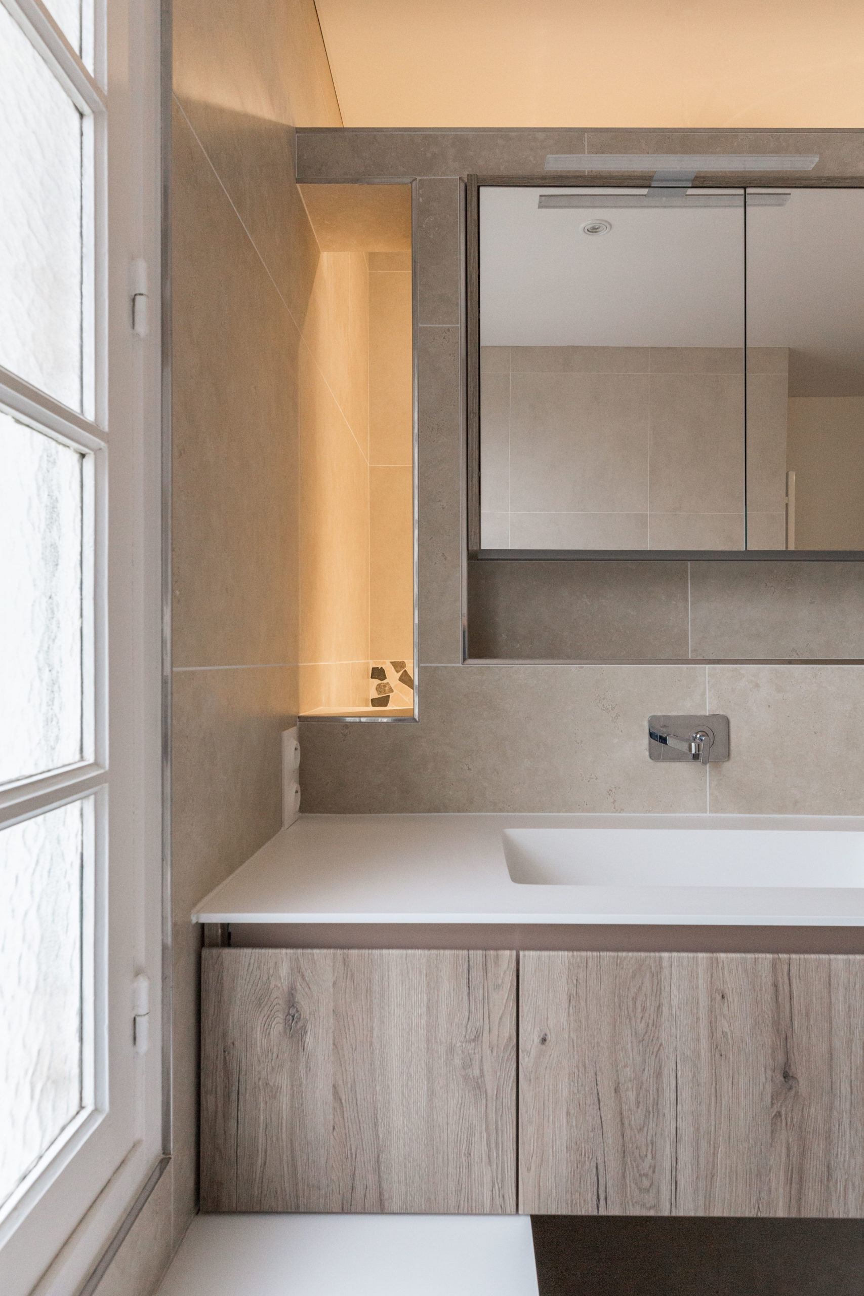En effet, cette petite salle de douche méritait d’être optimisée et fonctionnelle, c’est la raison pour laquelle nous avons inverser le sens d’ouverture de la porte afin d’élargir le plan de toilette. Ce dernier en ocritech de chez porcelanosa à été façonné en pan coupé.