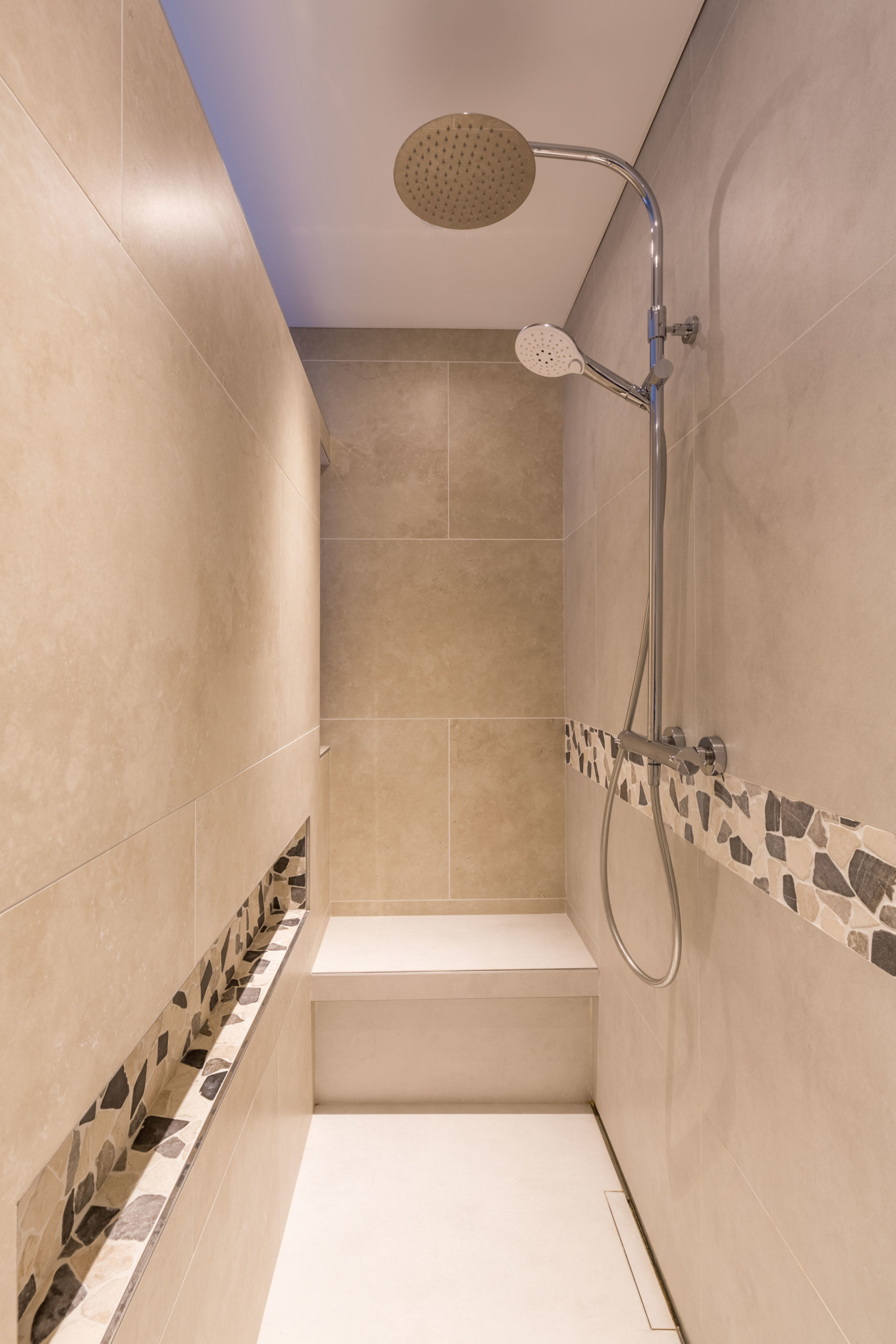 Pour finir, côté matériel de la salle de douche, la robinetterie est simple et épurée, un thermostatique avec inverseur pour contrôler la douchette à main et la douche de tête séparément.
