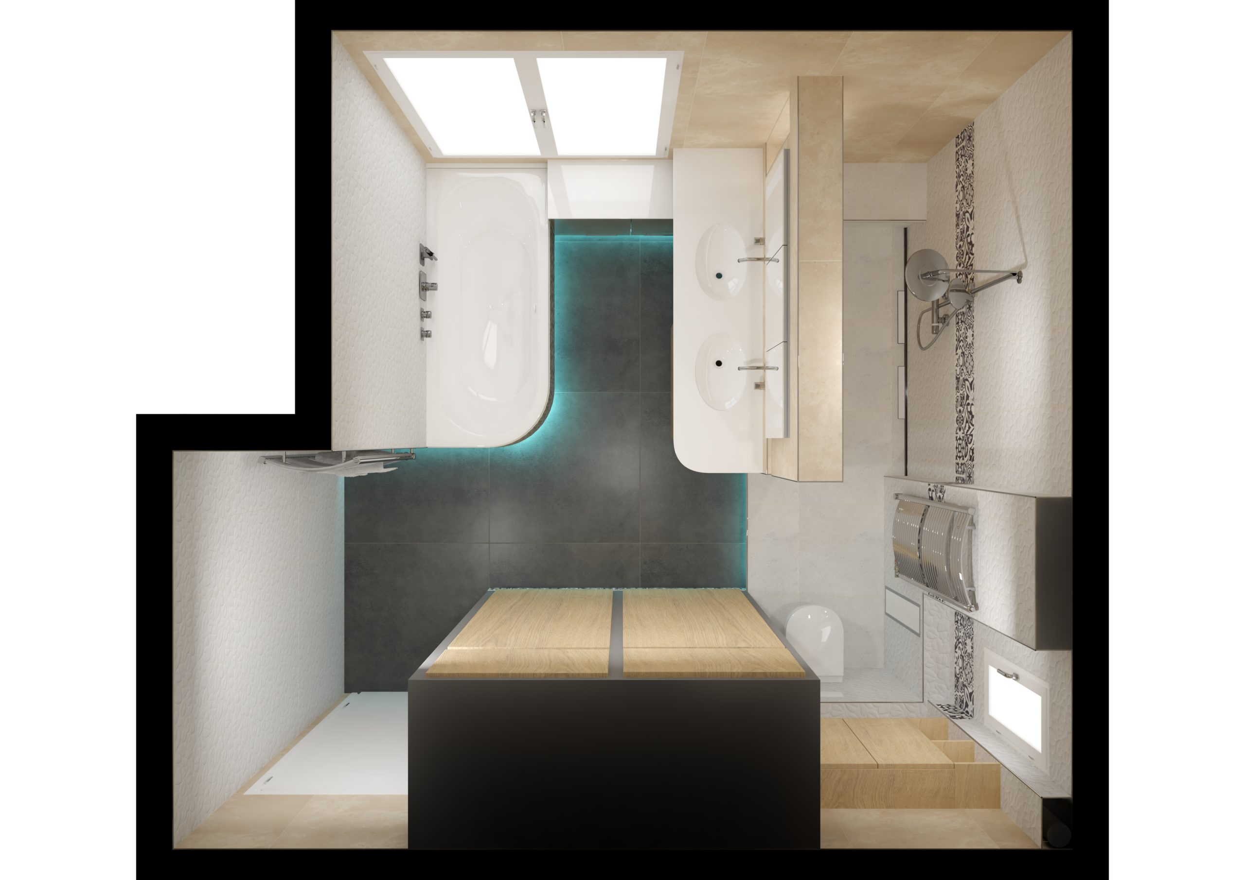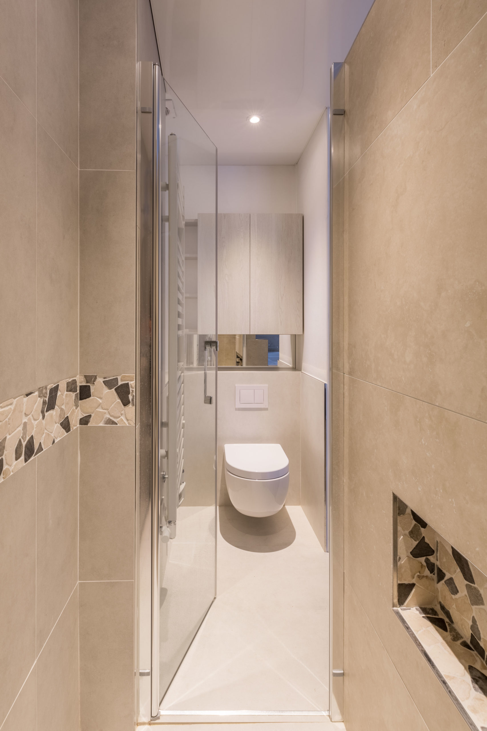 Nous avons mis un plafond tendu laqué, ce qui permet de refléter la lumière naturelle sur le plafond et ce qui éclaircit. Amène plus de luminosité. Touche originalité : Un puis de lumière a été crée afin de ramener de la lumière dans la douche qui est située derrière. La contremarche avec lumières indirectes ce qui amène modernisme avec une lumière tamisée chaleureuse.
