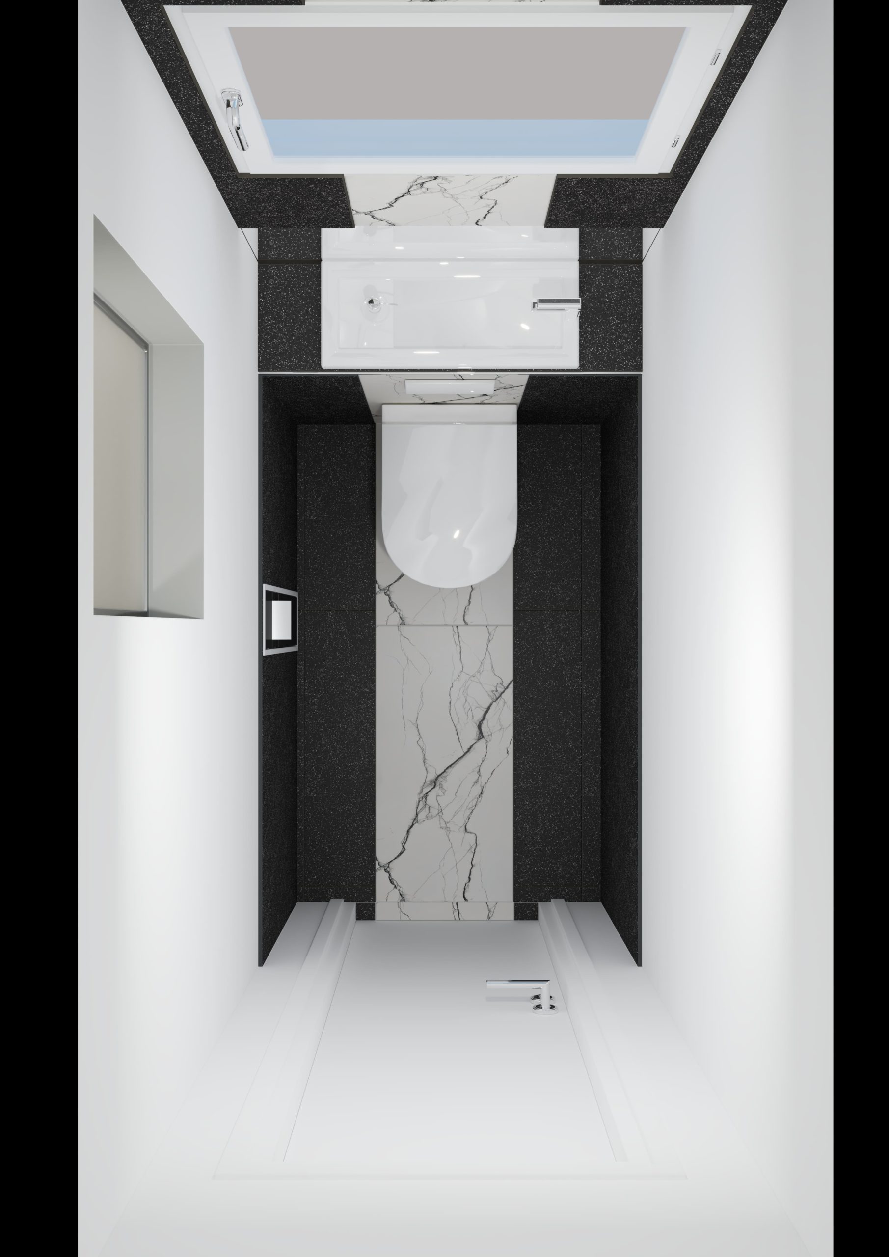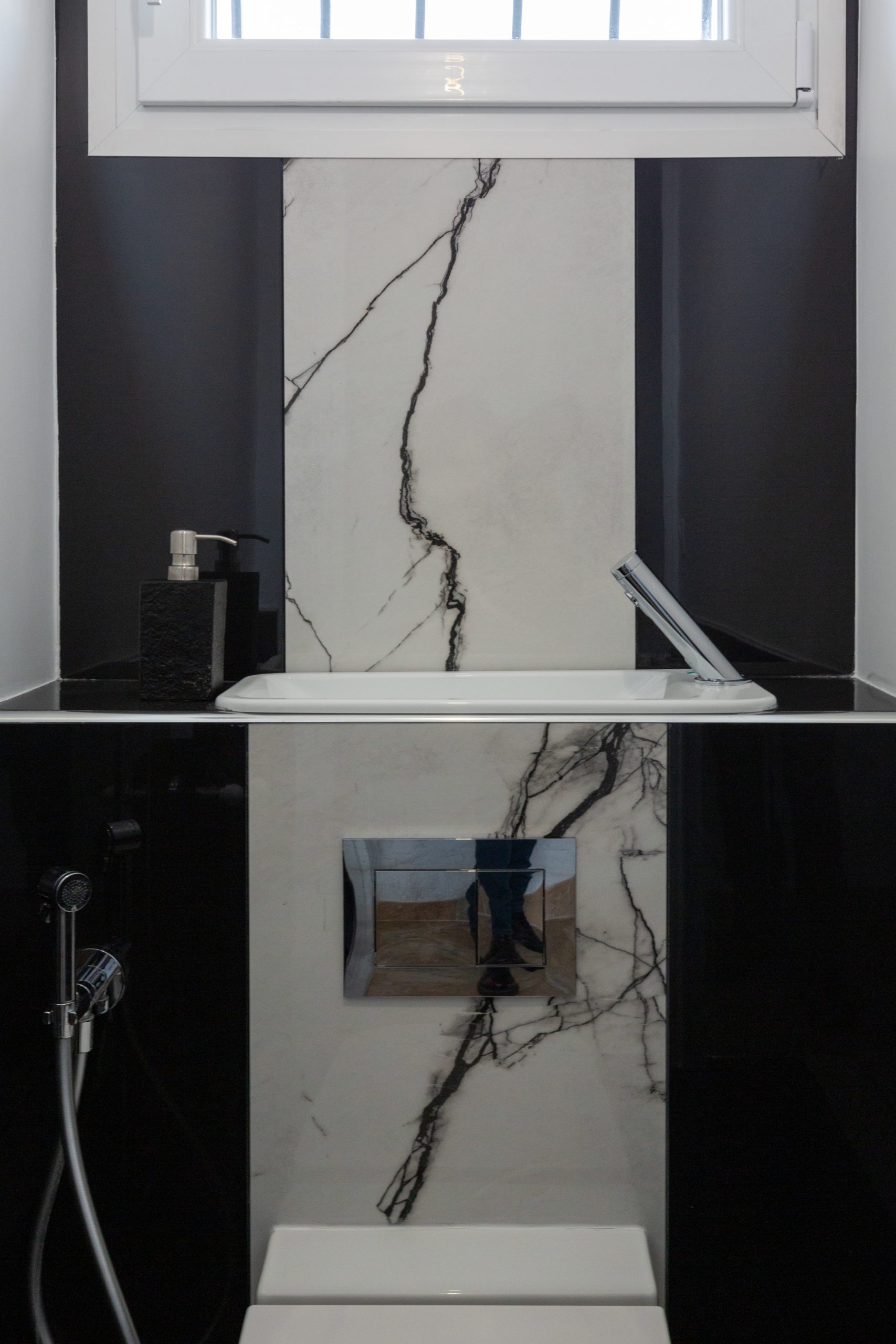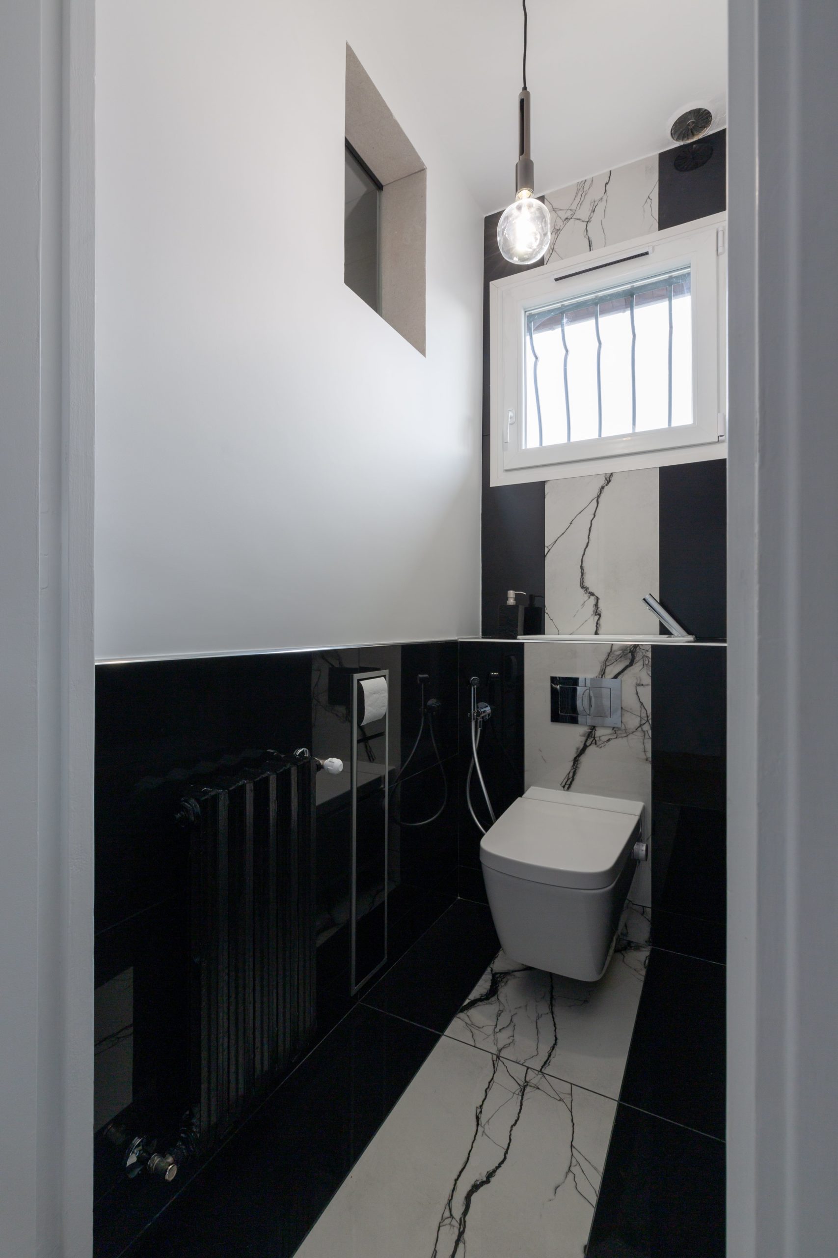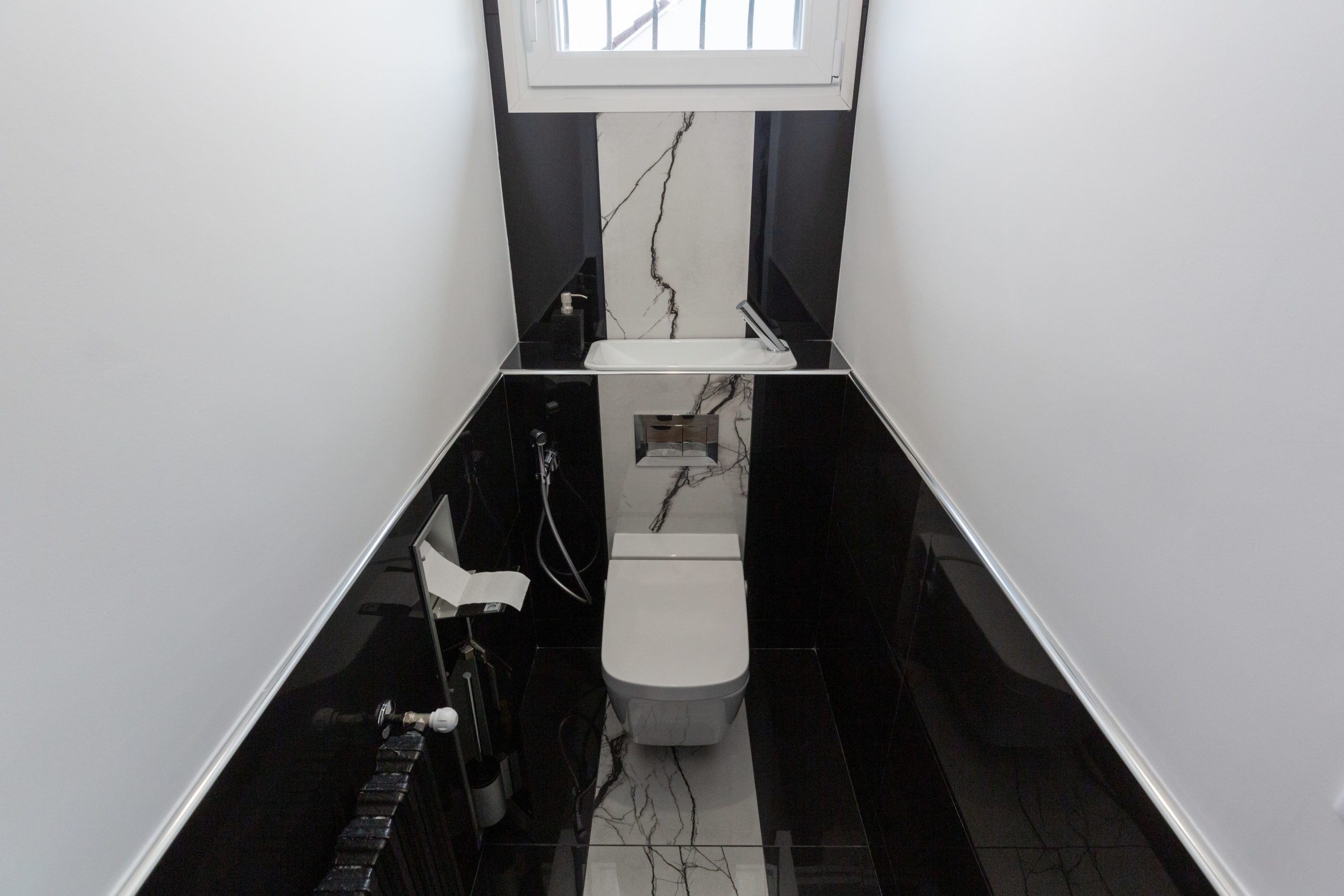 Réalisation de toilette suspendu lavant. Le point fort de ce projet est sans aucun doute le travail du carrelage noir brillant avec la frise centrale en marbre blanc.
