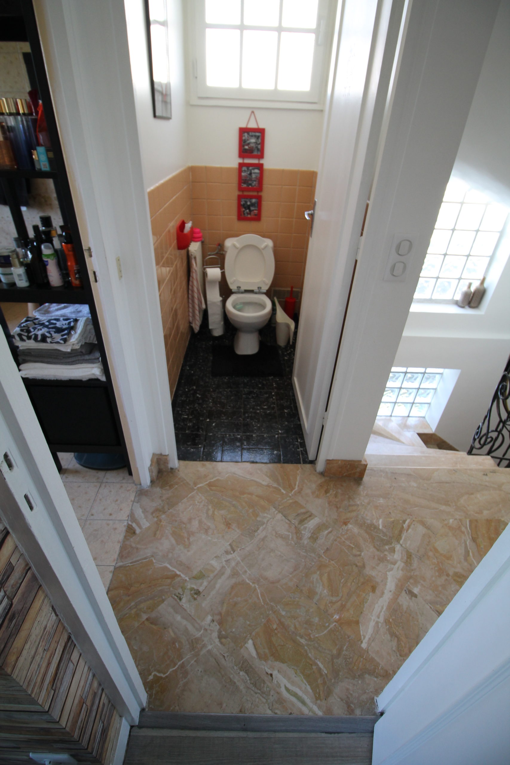 Petit plus, nous avons installé un cabinet de toilette de la marque emco, en noir brillant également, cela permet de ranger le papier toilette et la brosse.