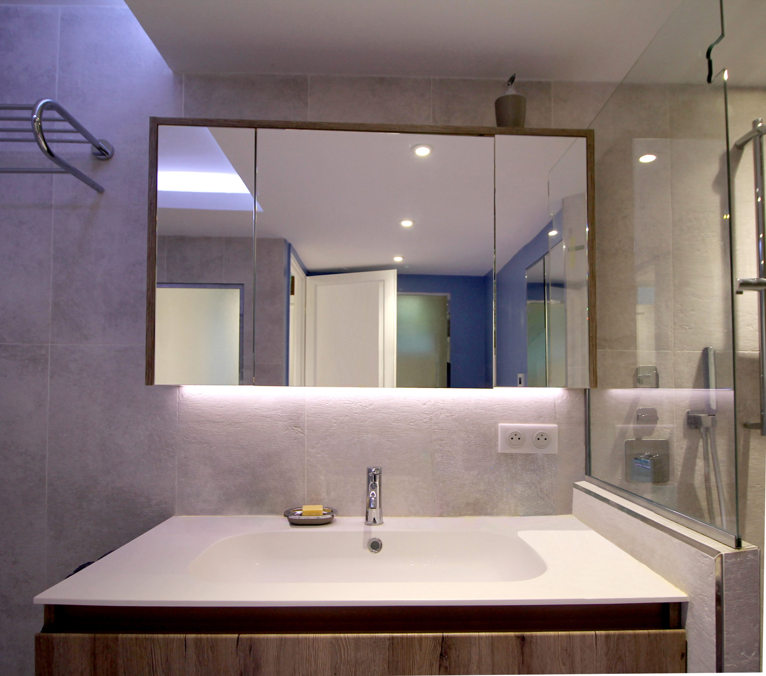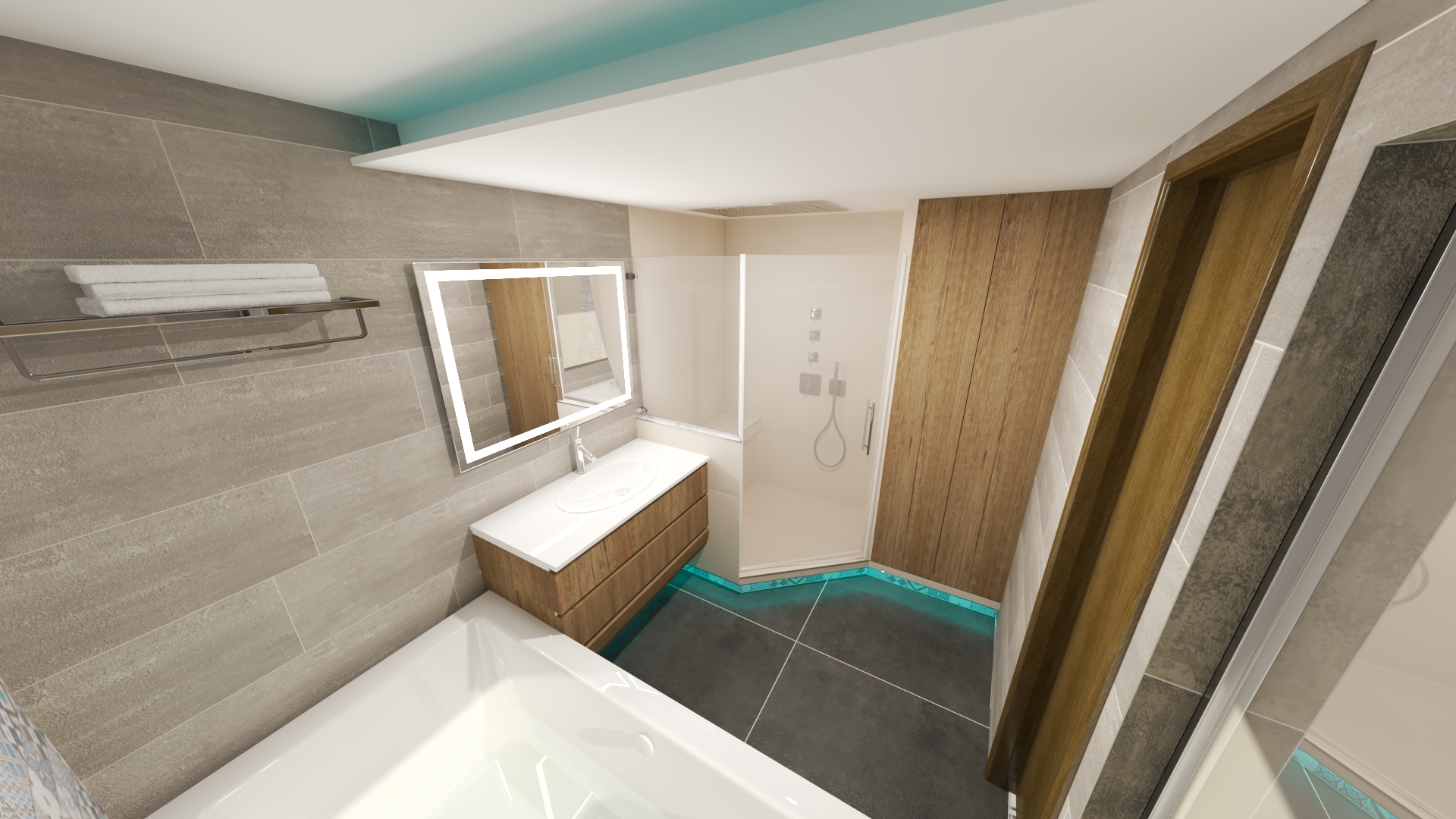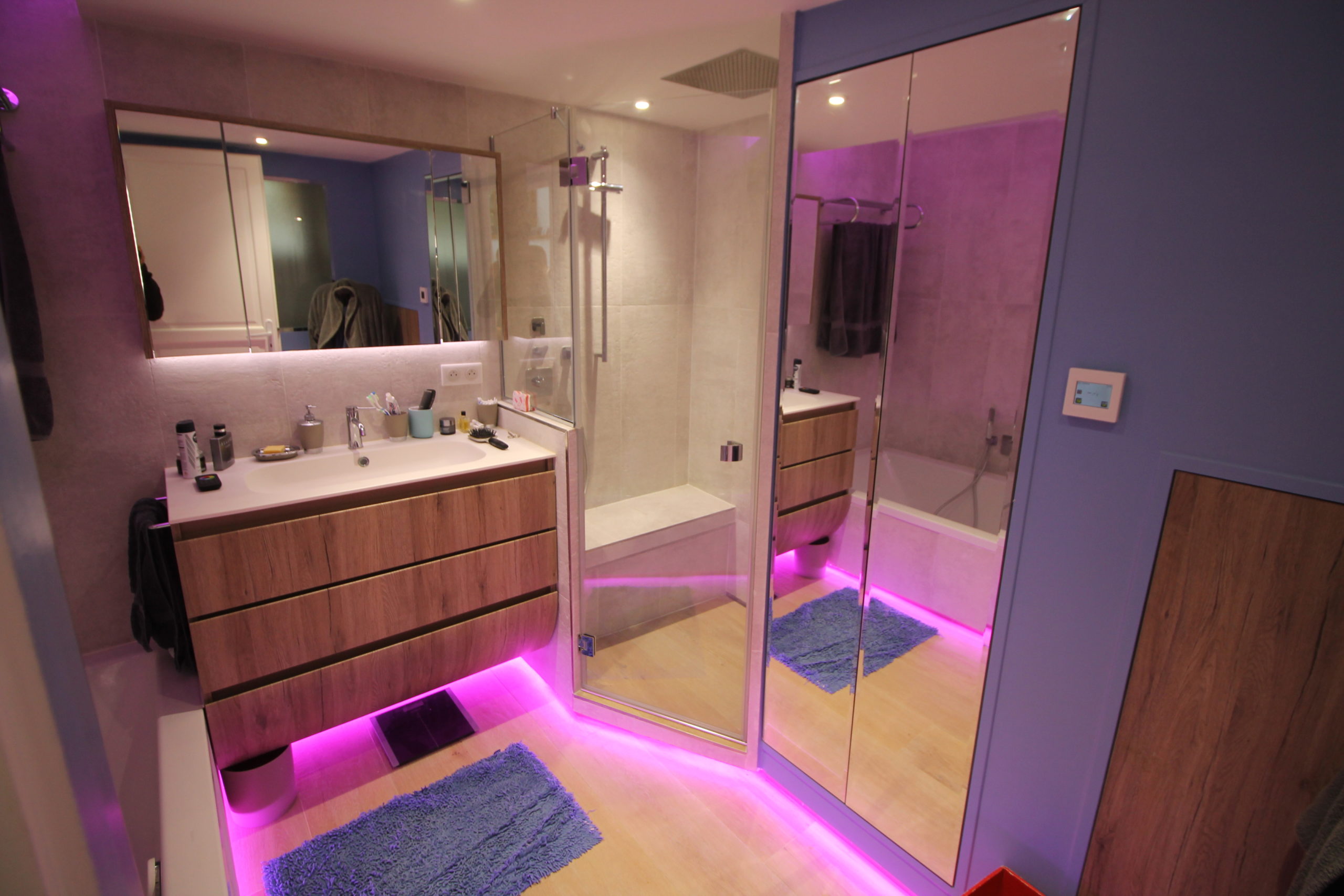 Sur ce projet, nous avons réalisé une extension de la mezzanine, la création d’un WC séparé, et la restructuration complète de l’escalier menant au WC séparé. Initialement, la hauteur et l’espace de cette salle de bain n’étaient pas adaptés pour l’utilisation de nos clients. Nous avons conçu une salle de bain fonctionnelle. En effet, une percée a été réalisée dans le faux-plafond afin que nos clients puissent être debout sans se cogner la tête ! Enfin, côté look, nous avons intégré des LEDS sur le pourtour de toute la pièce.