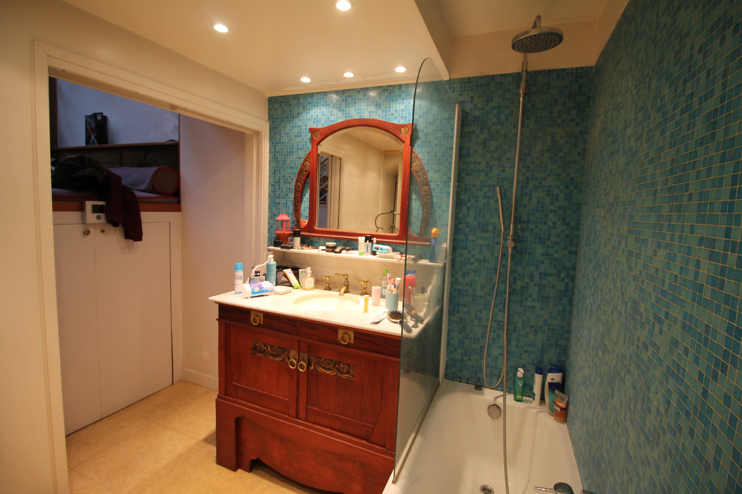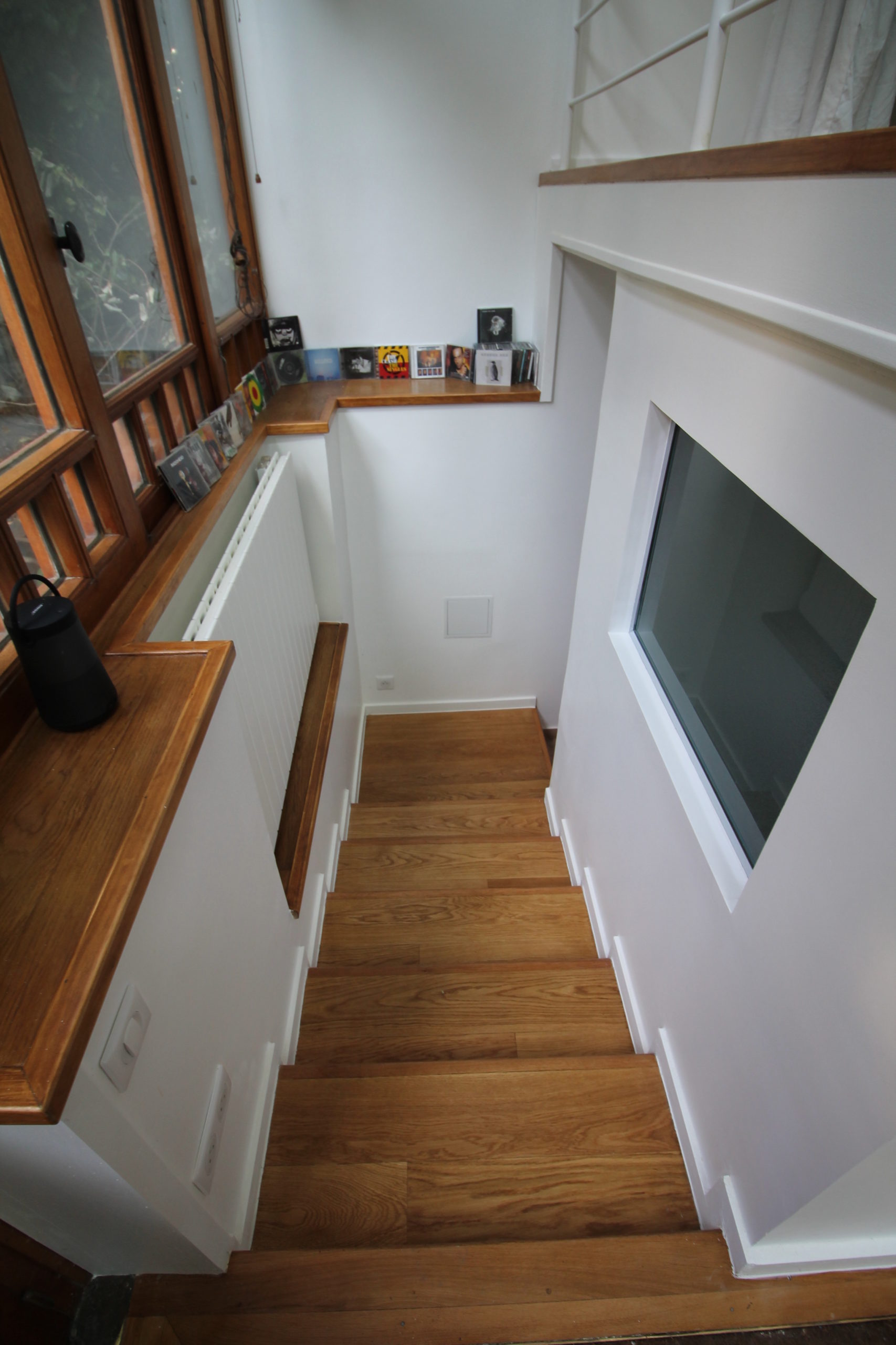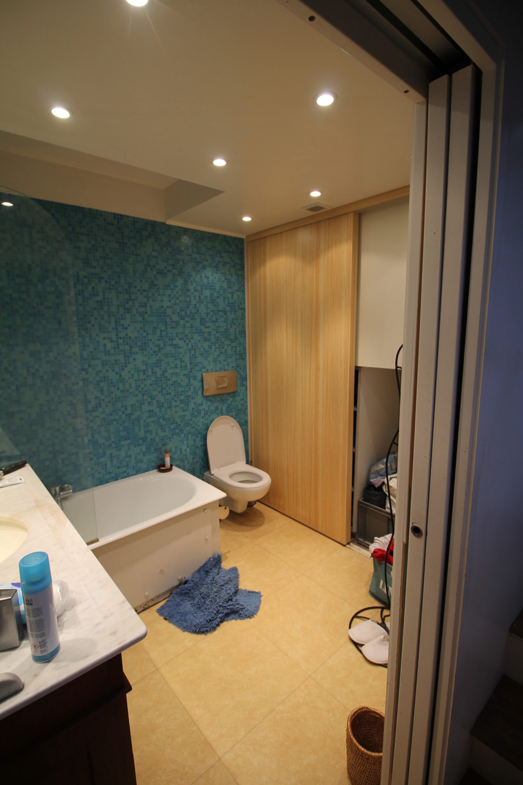 Sur ce projet, nous avons réalisé une extension de la mezzanine, la création d’un WC séparé, et la restructuration complète de l’escalier menant au WC séparé. Initialement, la hauteur et l’espace de cette salle de bain n’étaient pas adaptés pour l’utilisation de nos clients. Nous avons conçu une salle de bain fonctionnelle. En effet, une percée a été réalisée dans le faux-plafond afin que nos clients puissent être debout sans se cogner la tête ! Enfin, côté look, nous avons intégré des LEDS sur le pourtour de toute la pièce.
